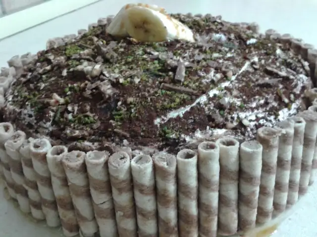 Üzerine kremşanti , kakao ve toz fıstık , çikolata rendesi , etrafınıda rulo kat ile çevirdim .
