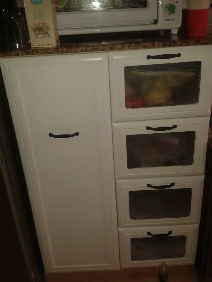 sizden ricam bitmiş temizlenmiş ve yerleştirilmiş halinin de fotolayıp eklenmesi... en çok kullanişlılık yonunu ve temizlik yönünü merak ediyorum acaba zamanla kabarma yapar mı. cif le temizlenince bozar mı vb şeyler. ben çok yağ çöz kullanıyorum. aspiratör tarafı yağlanınca civ ve yağçözü basıyorum dolaba. benim dolabım da aynı sizinkinden ... temizliği çok basit ama şık değil. ev kendimizn. ancak bütce yeni dolabı kaldırmaz. kayın pederim mobilyacı . ancak sadece malzemesi bile bin beşyüz tutuyo... şu an onu yapamayız.... acaba boyasak nasıl olur diye düşünürken bunu gördüm.. takipteyim. sizde kullandılca buraya nasıl oldugunu yazarsanız biz de boyayabiliriz. merak içindeyim. sevgilersağolun arkadaşlar:) öncelikle bir türlü son kata yani 4.kat boyamaya geçemedik. Dün misafirim vardı bu akşamda yapalım dedik hoba rulo fırça donmuş iki günde yarın sabaha kaldı. rulo fırçarı yedekli almakta fayda var. İlk önce bizde folyo yapışkanlı kağıtla deneyelim dedik olmadı. en iyisi boyama. nalburdan 700 ml i 25 tl ye aldık. 3 kat gitti. minicik ama o kadar çok gidiyor ki biz yedekli 2 kutu aldık. yeni kutuyu yarın kullanacağız.