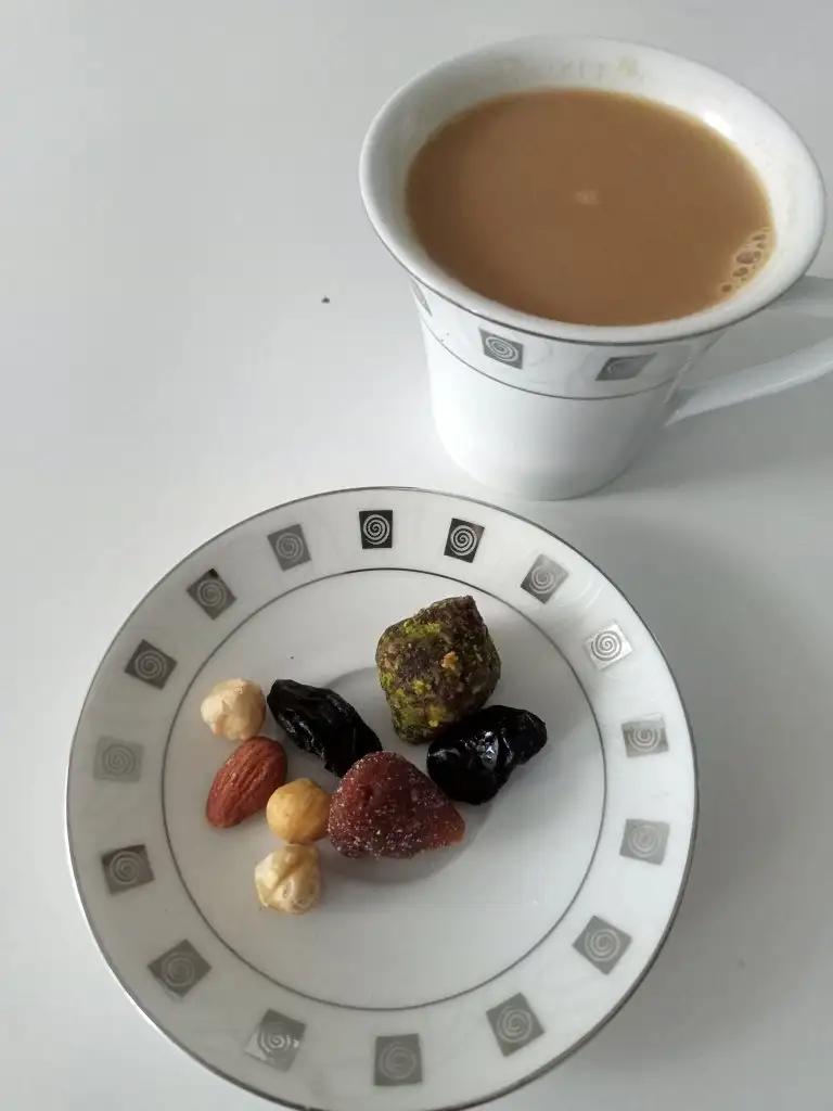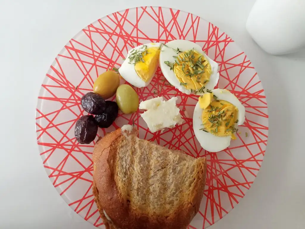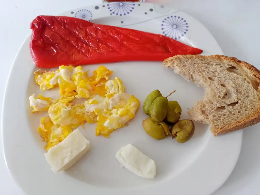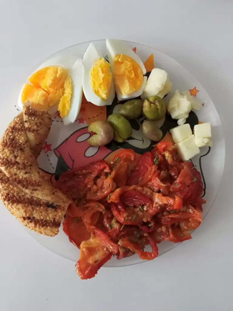 Bu sabahında fotoğrafı yok o yuzde yazayım 1 dilim ekmek, 1 dilim peynir, 1 haşlanmış yumurta, 1.5 ceviz, 1 tatlı kaşığı pekmez , 2 minik domates 🍅 🤭
