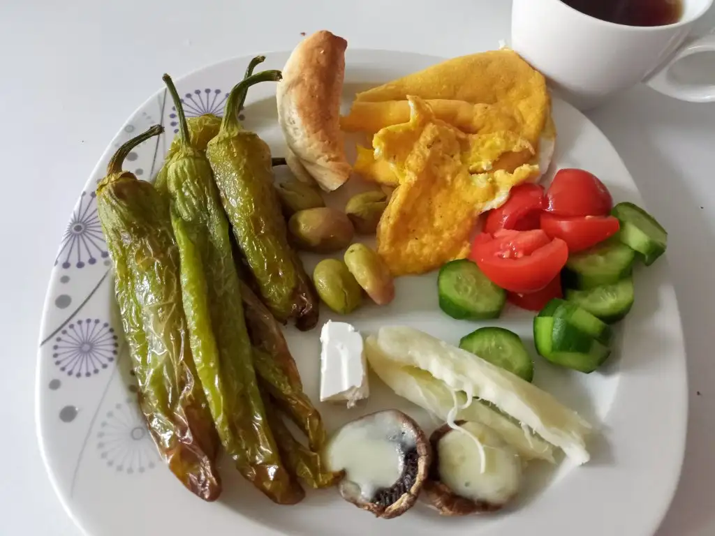Ben çok geç kahvaltı ettim. Ekmeksiz 2 yumurta 2 de bıldırcın yumurtası, dil peyniri 2 kiraz domates siyah zeytin