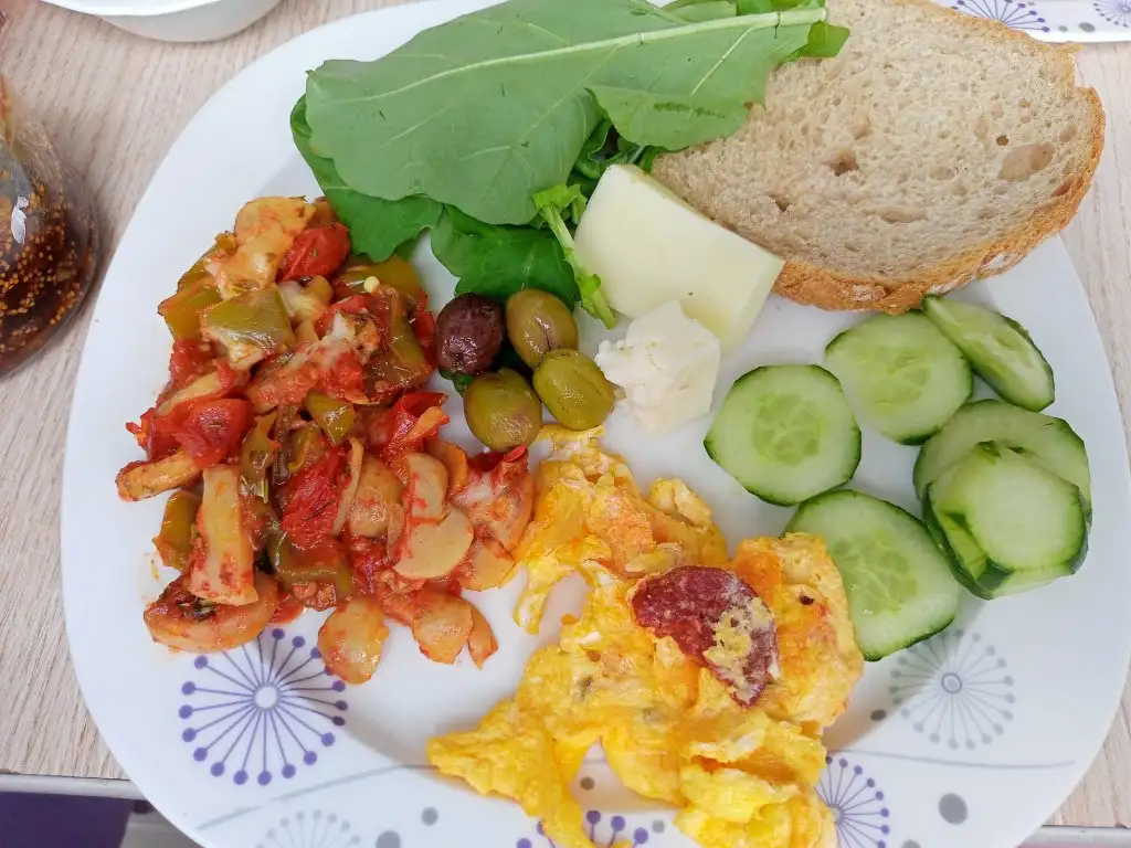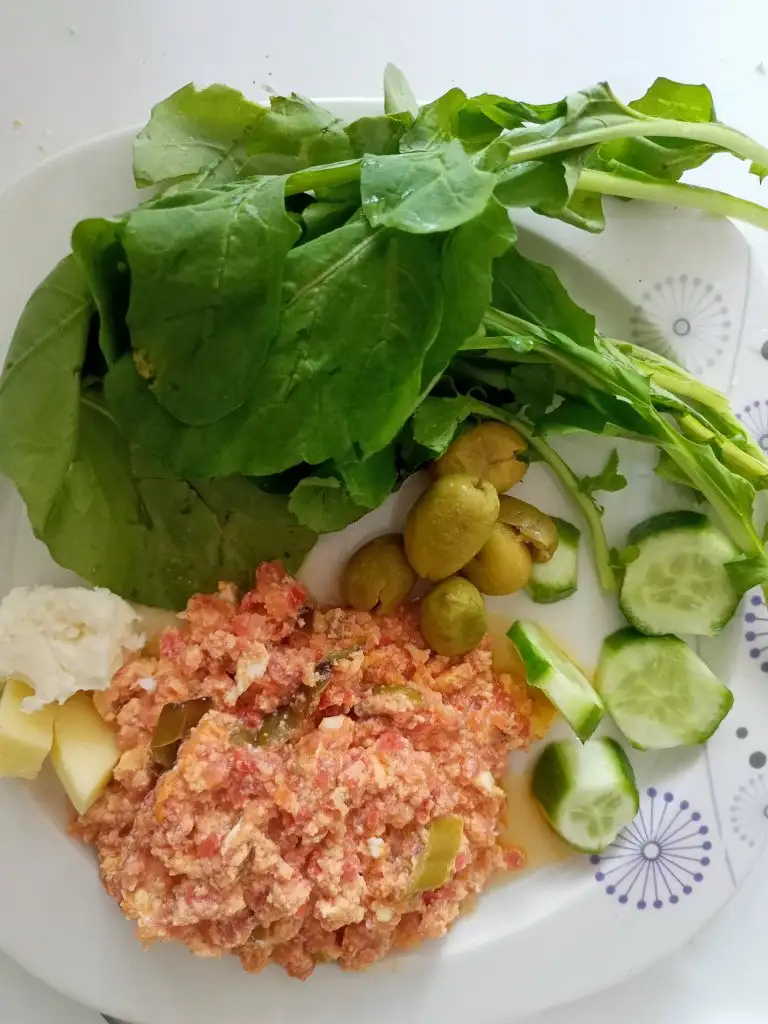 kahvaltıda 1 tabak menemen, beyaz ve tam buğday karışık 2 dilim ekmek, kavanoz kapağından az küçük 4 tane pankek 😔😔1.5 yemek kaşığı bal fıstık ezmesi, 2 dilim peynir, salatalık, yeşillik öleyim ben 😔