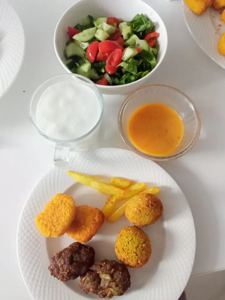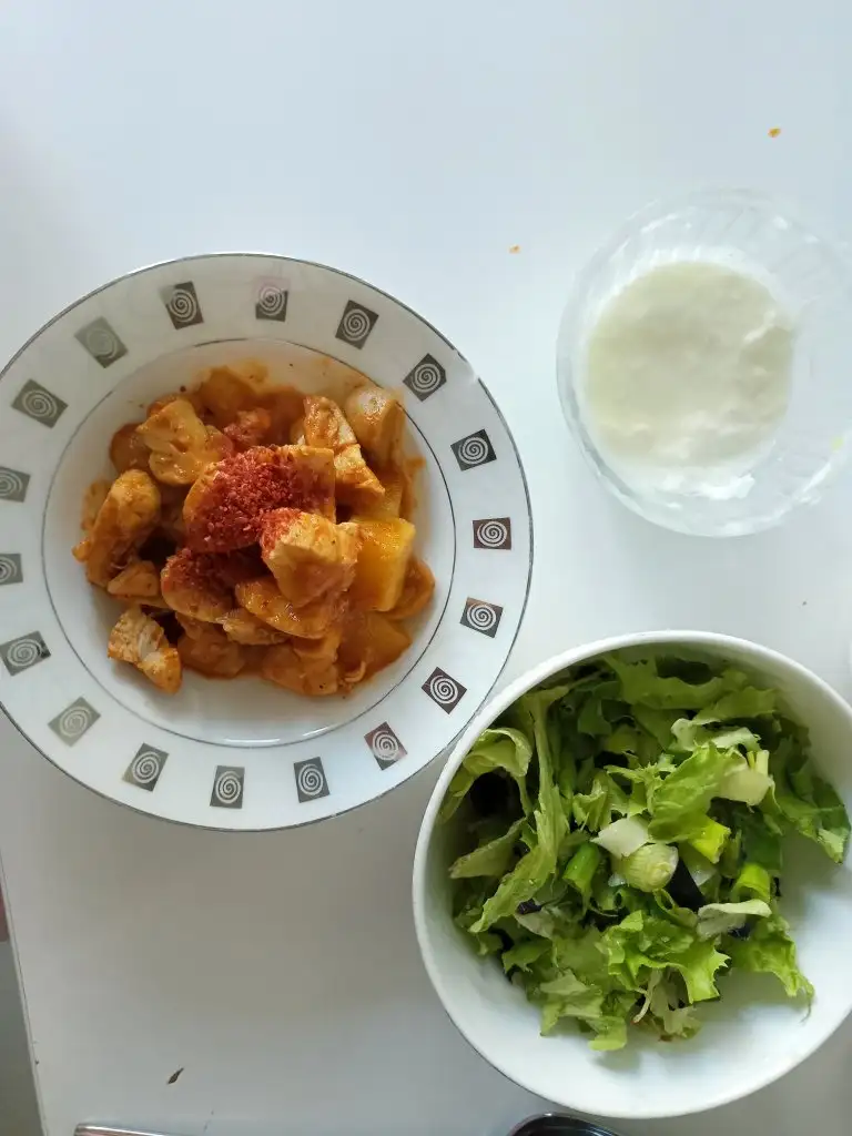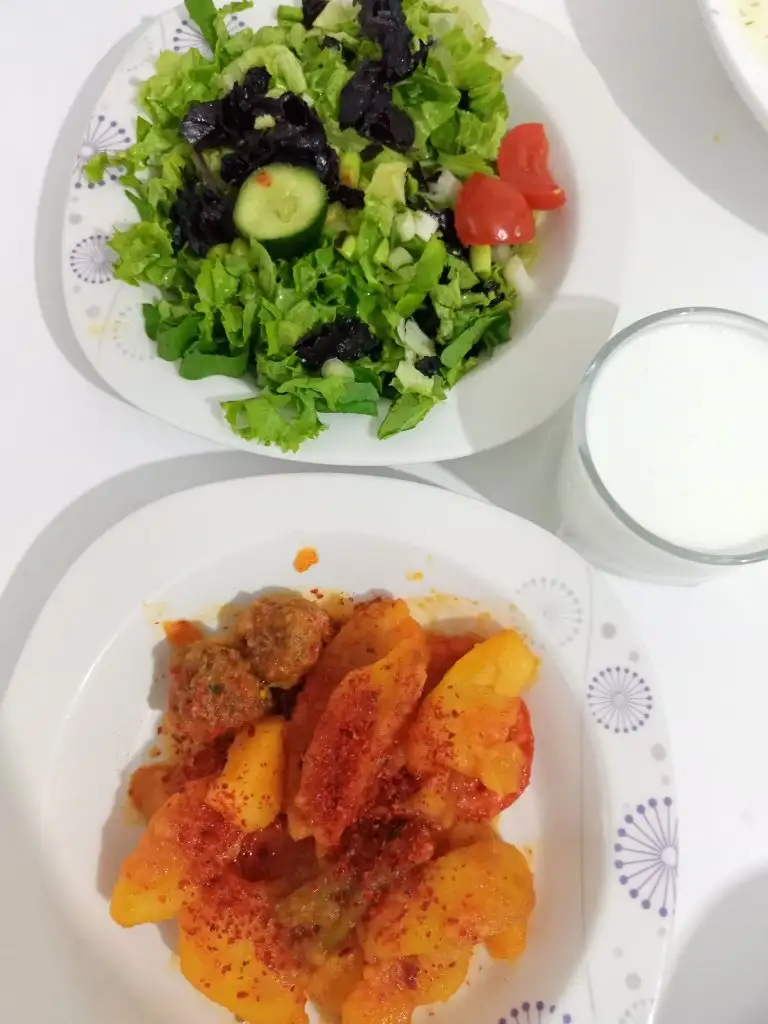 akşam yemekte 1 tatlı kaşığı pilav, kanat, salata, 1 büyük ayran