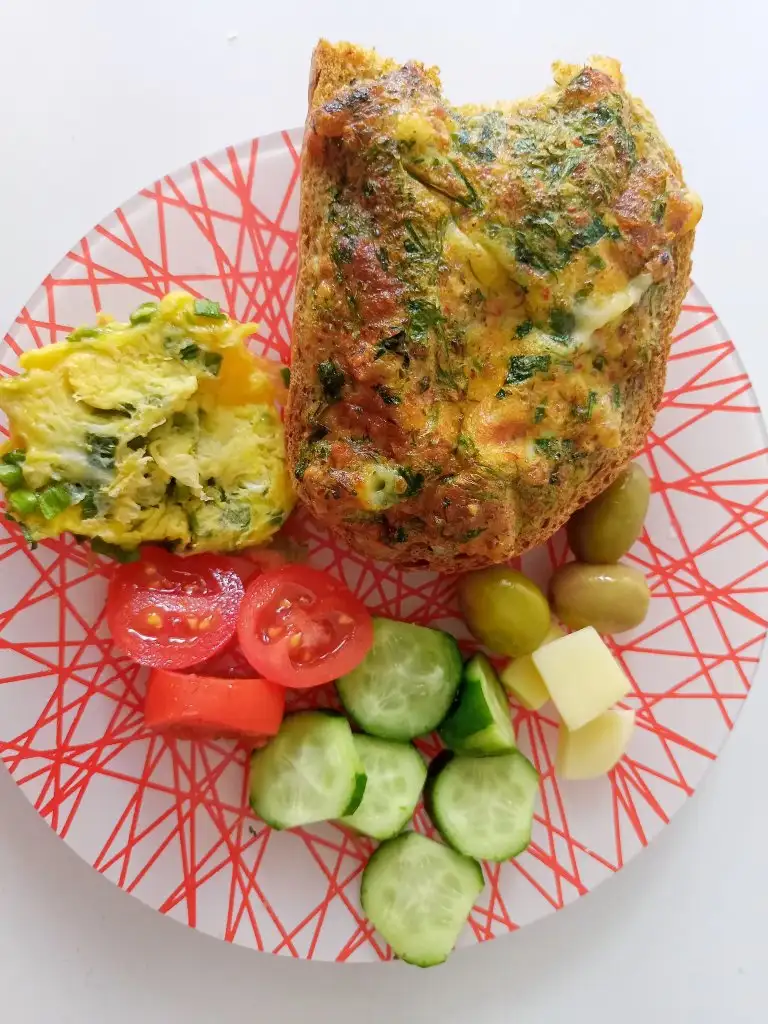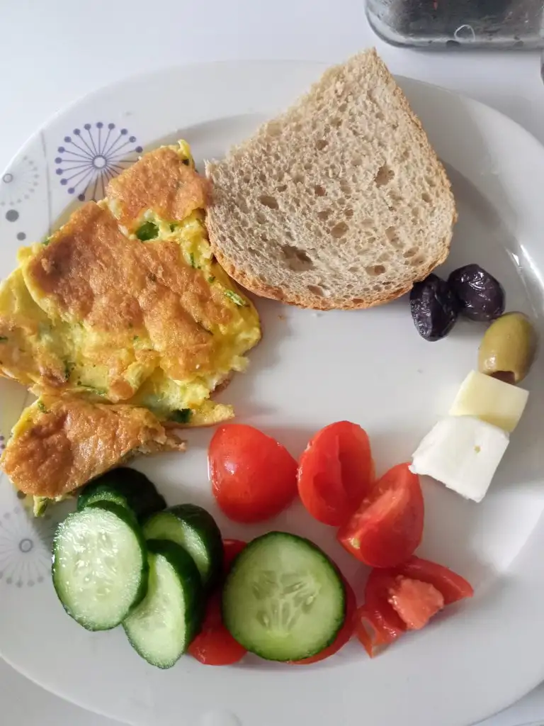 Kahvaltıda görünenin yarışı kadar daha omlet 1 yemek kaşığı reçel ve fıstık ezmesi, yarım dilim peynir, yarım dilim beyaz ekmek, 1 dilim ağlayan pasta yedim 🙁