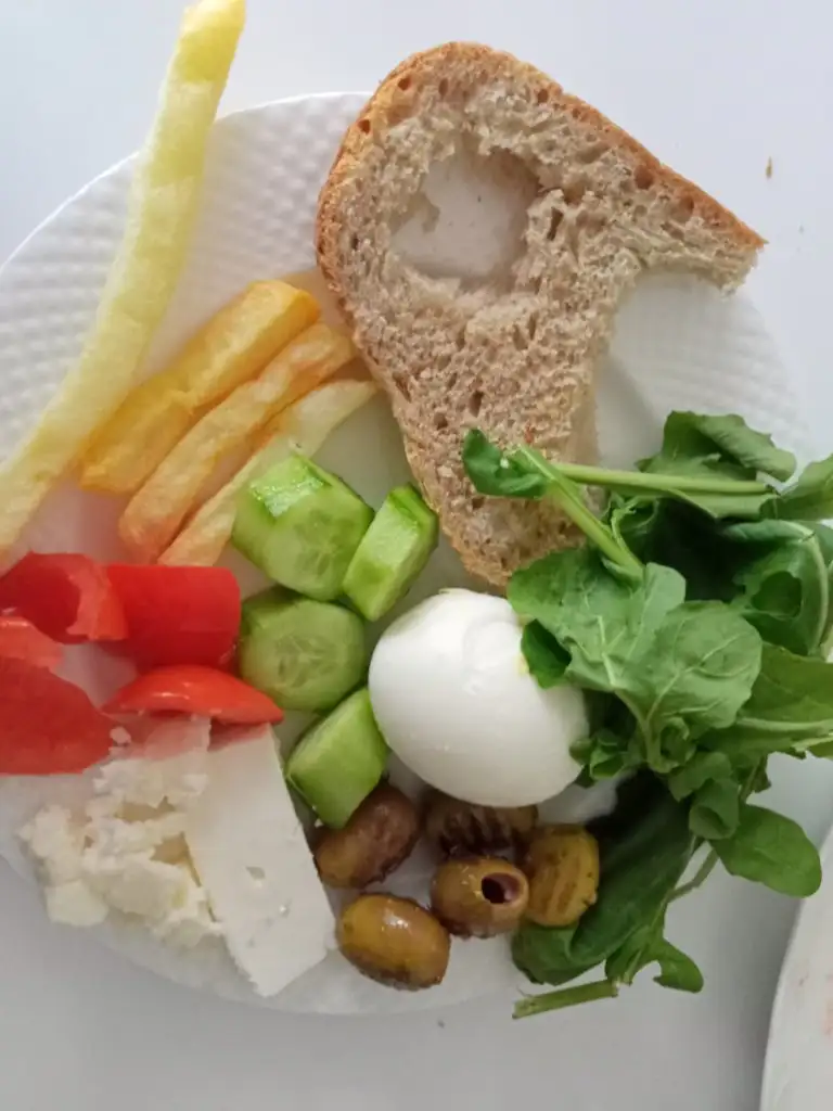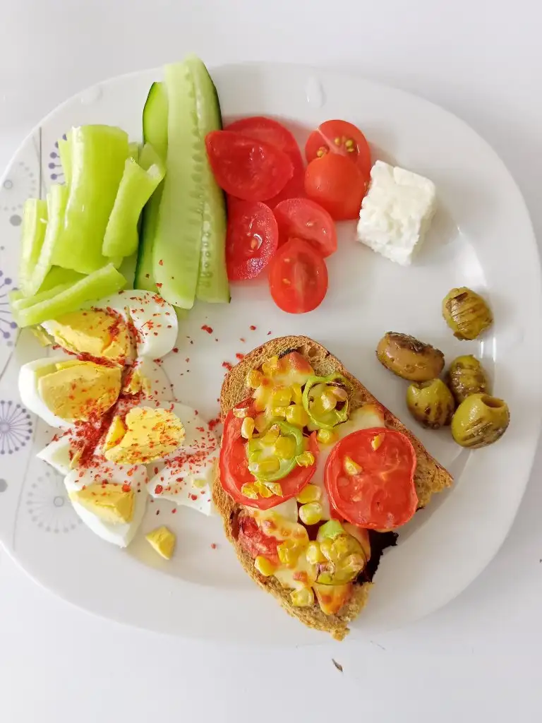 Kahvaltı fotoğrafı vardı silmisim yanlışlıkla 1 yumurta, 1 dilim peynir, söğüş ,4 zeytin,2 dilim ekmek, 1.5 yemek kasigina yakın fıstık ezmesi, 2 dilim ekmek