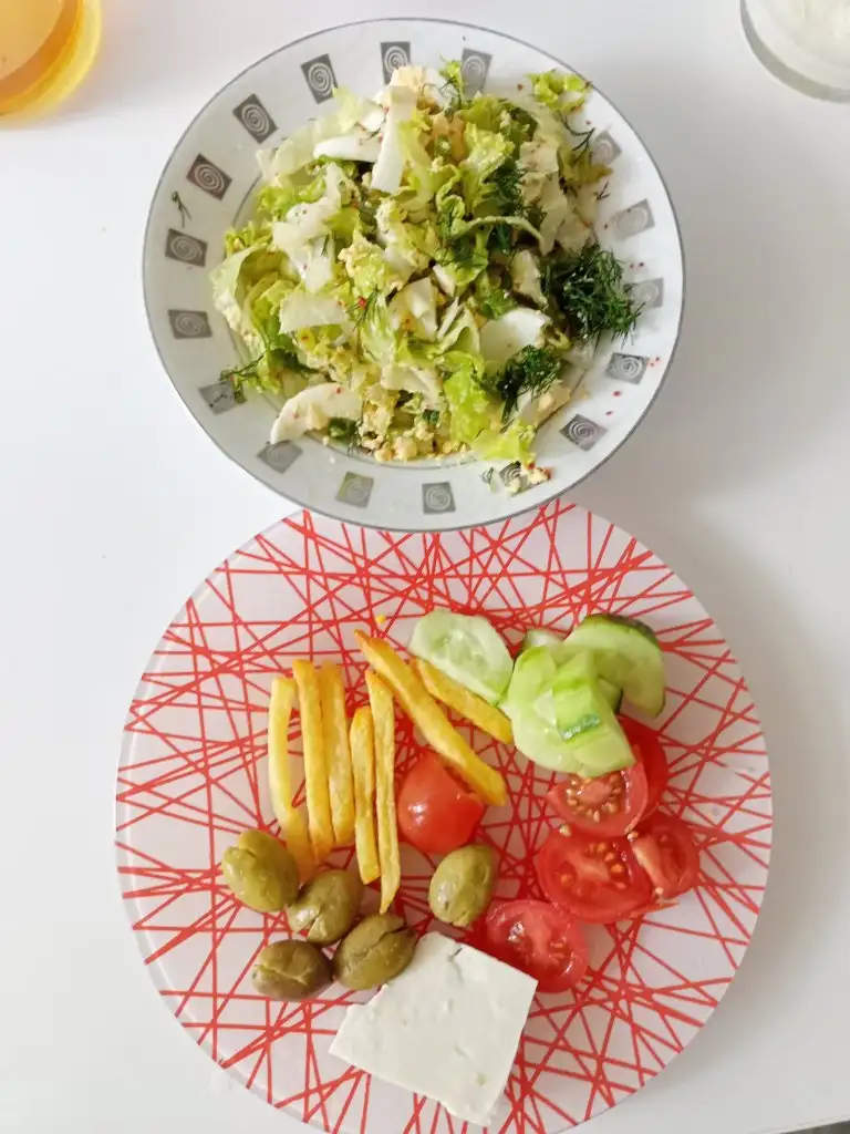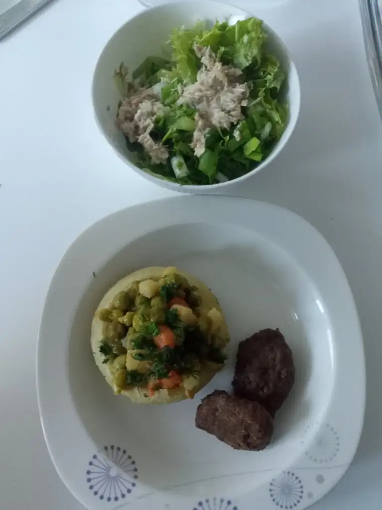 Ara öğünde bir tabak karpuz yedim 😥 3 kurabiye , 1 yemek kaşığı fıstık ezmesi bunlar farklı zamanlarda oldu baya yedim yani 😔 akşam tabağa ek görünen kadar daha patates, 1 köfte, 2 bardak ayran, 1 tatlı kaşığı ketçap içinde azda mayonez vardi