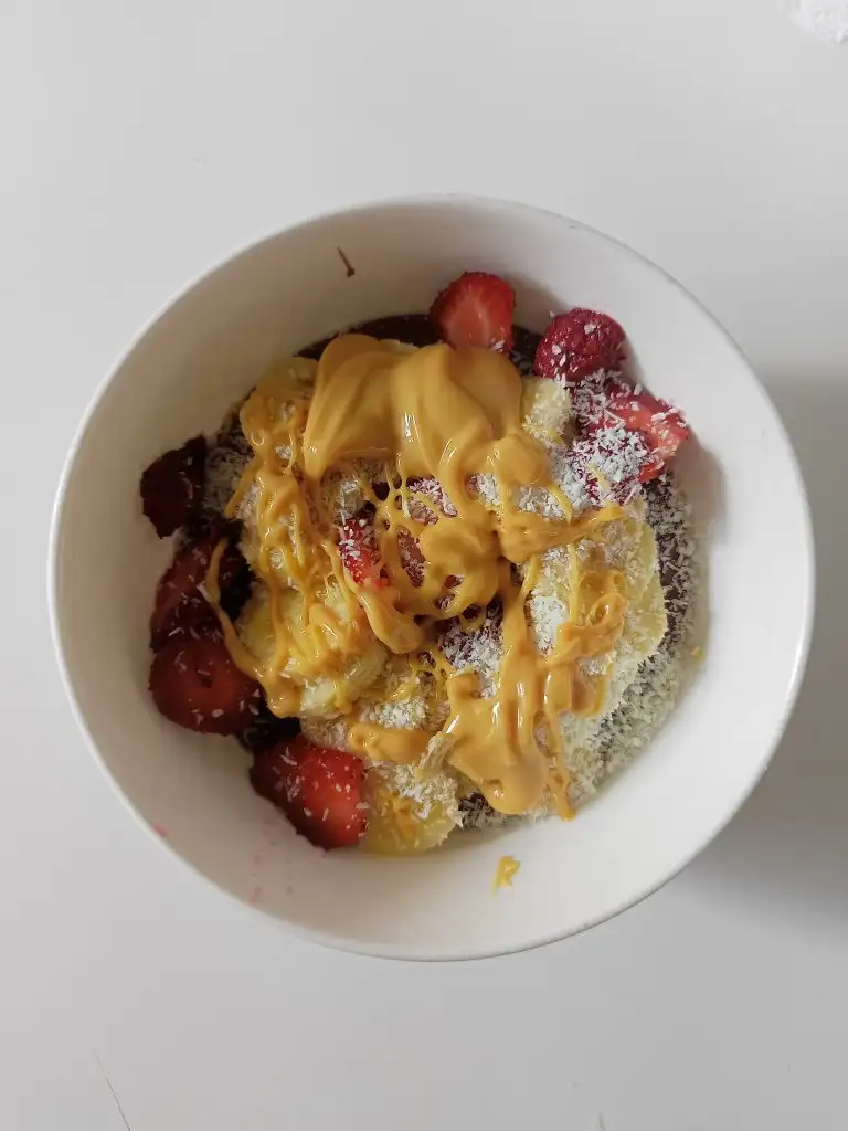 Yulaf lapası.kahvaltimdi görünenin çeyreği kadar daha ve 1 tatlı kaşığı daha kakaolu fıstık ezmesi yedim.