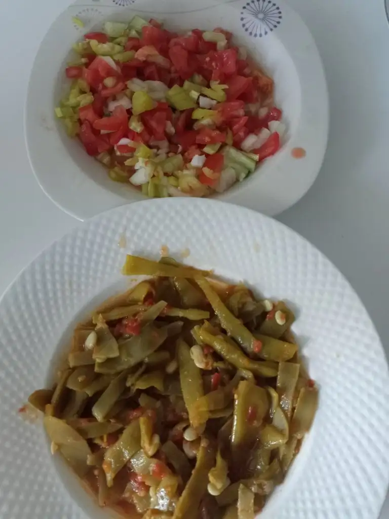 akşama gelelim bir tabak dolusu kuru fasulye, 1 enginar, 4-5 parça turşu, bir kase yoğurt, bir dilim karpuz