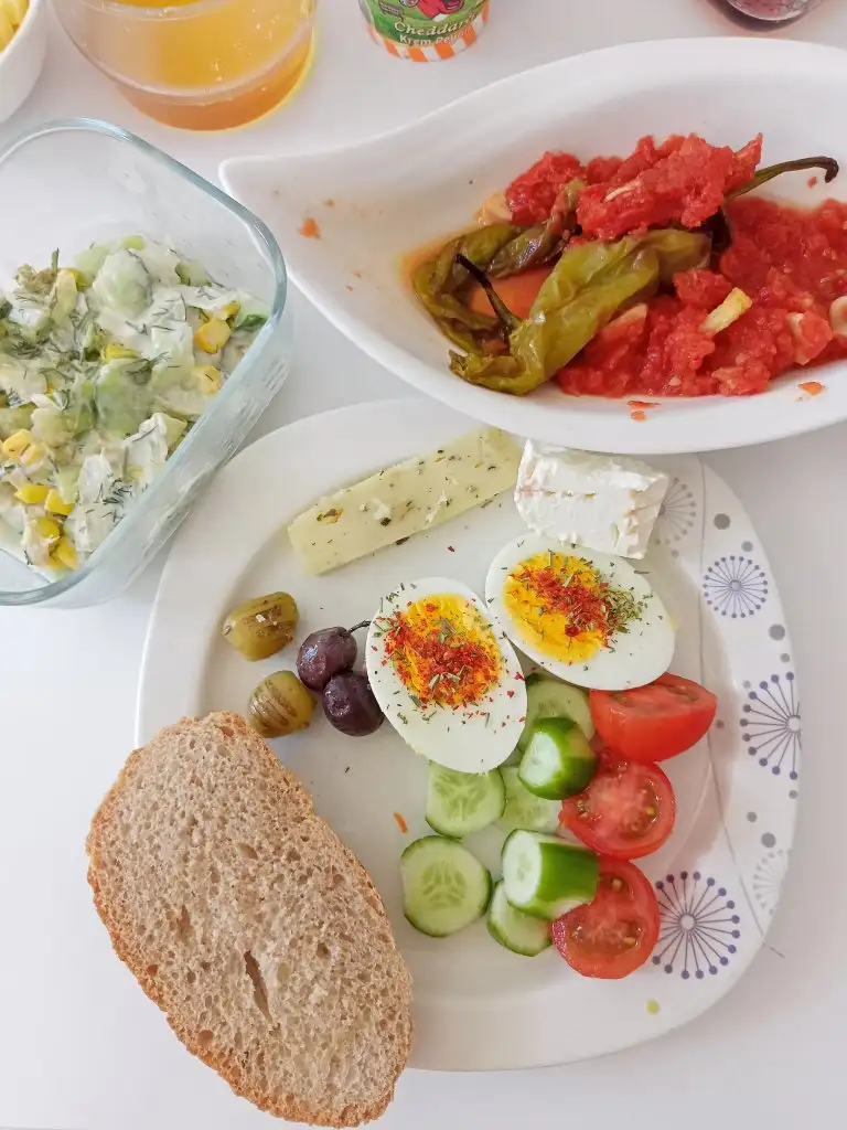Kahvaltıya ek 2 yemek kaşığı kırmızı biberle acuka benzeri sos yapmıştım ondan , 1 dilim peynir, 2 dilim ekmek ,1 yemek kaşığı fıstık ezmesi