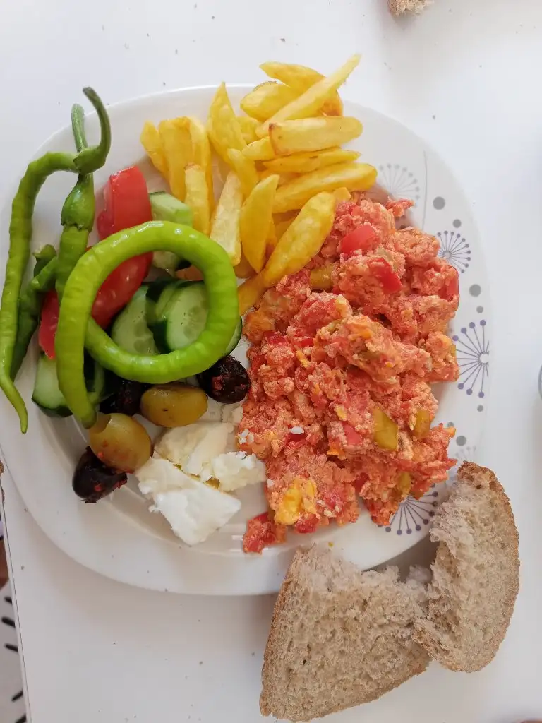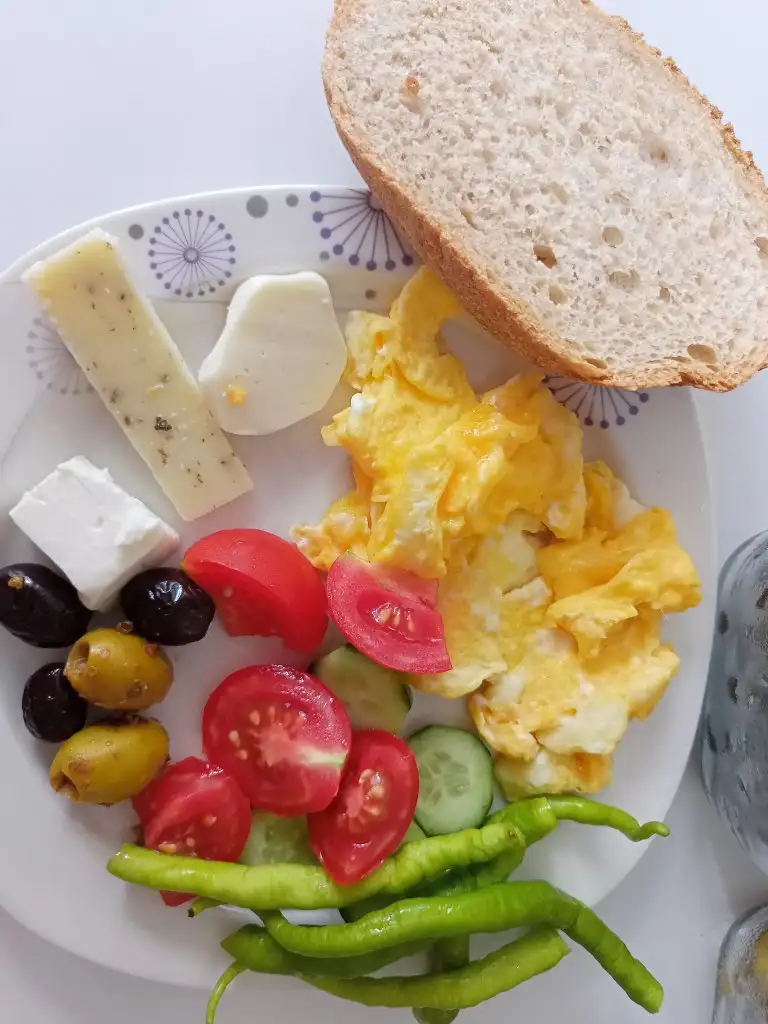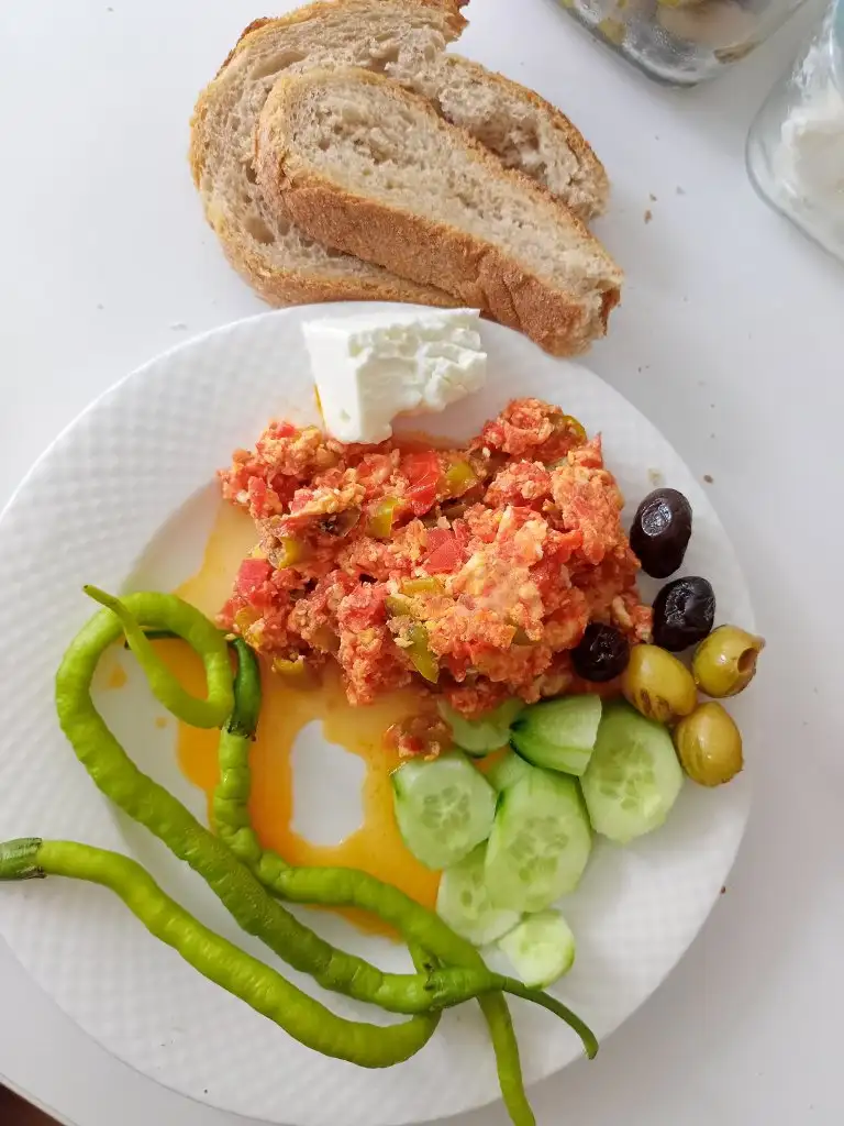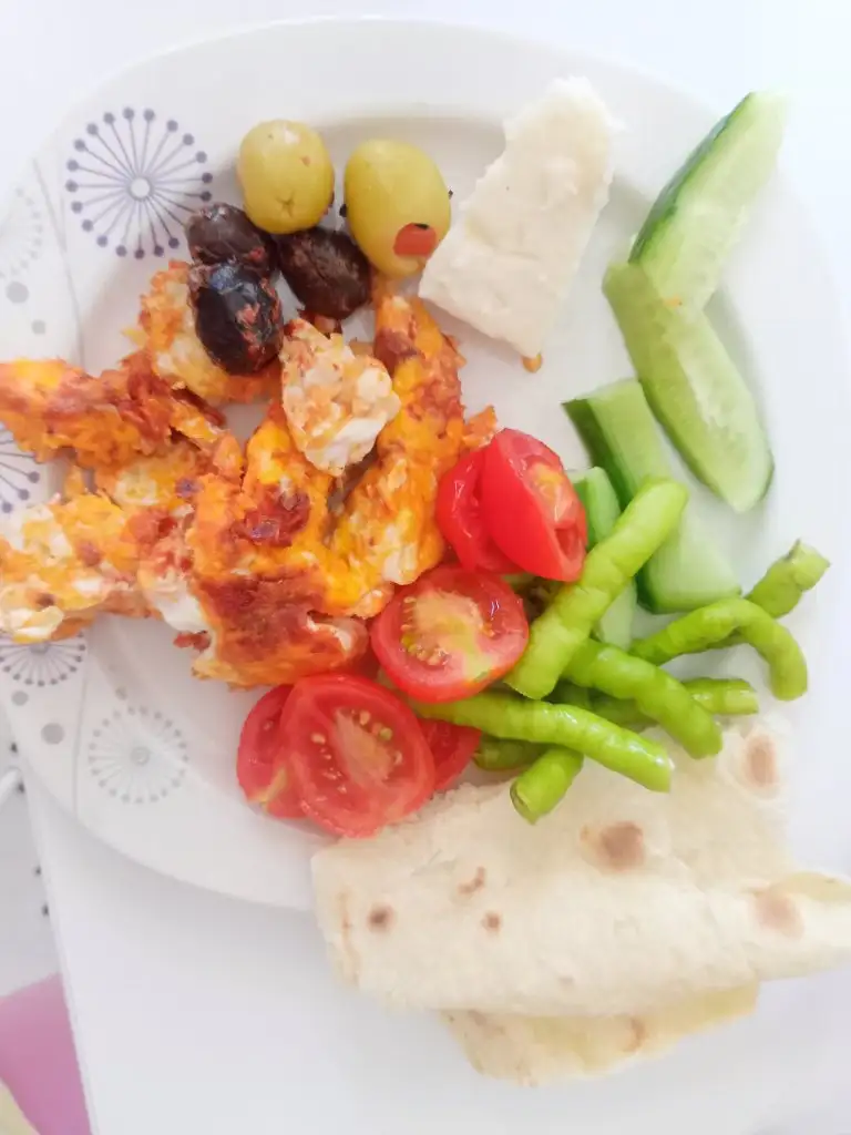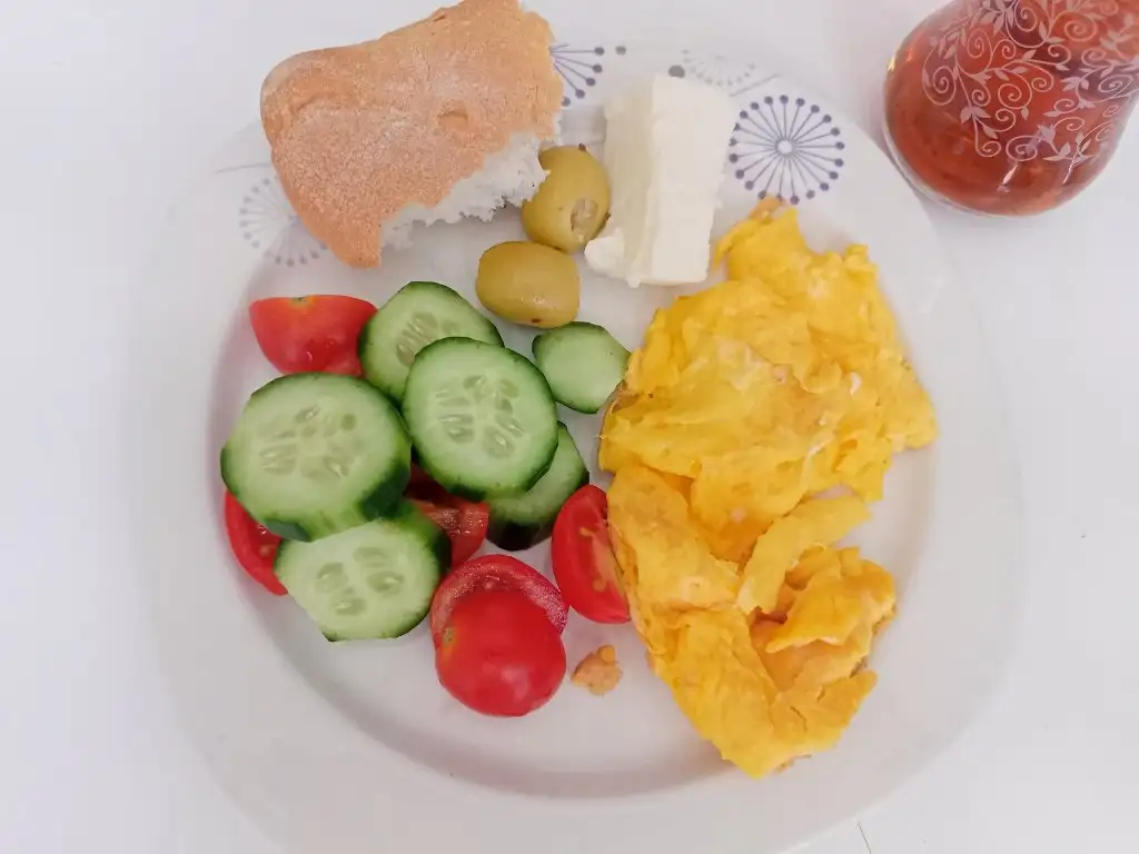 Goeunen kadar saha menemen, 1 yemek kasigi recel, 1 dilim peynir