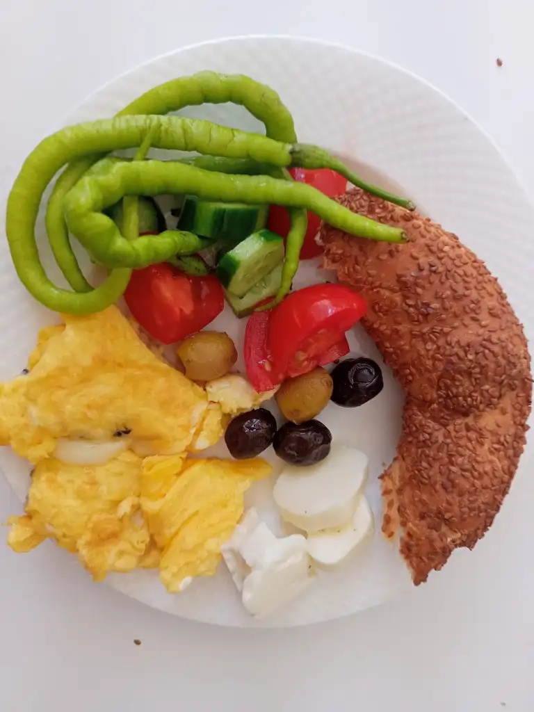 Dun kahvaltida 1 krep , 2 yemek kasigi patlicanli sos, 1 haslanmis yumurta, 3 dilim peynir, 4 zeytin, ceyrek kizarmis patates, yarim simit yedim