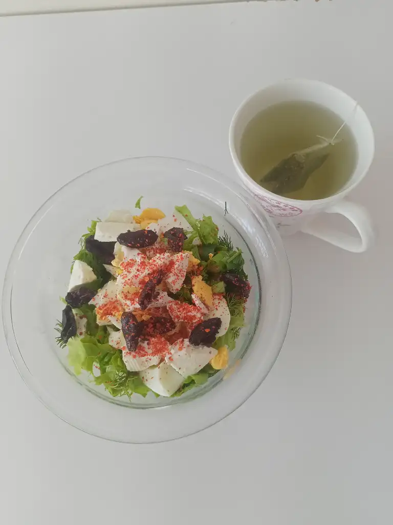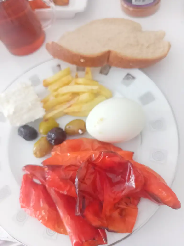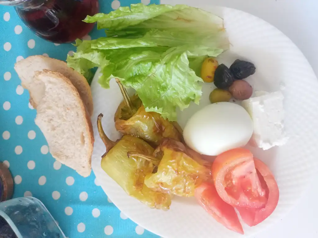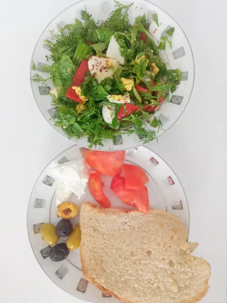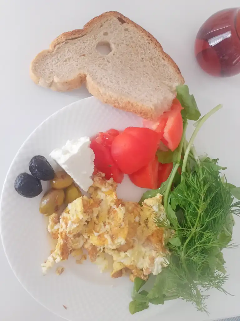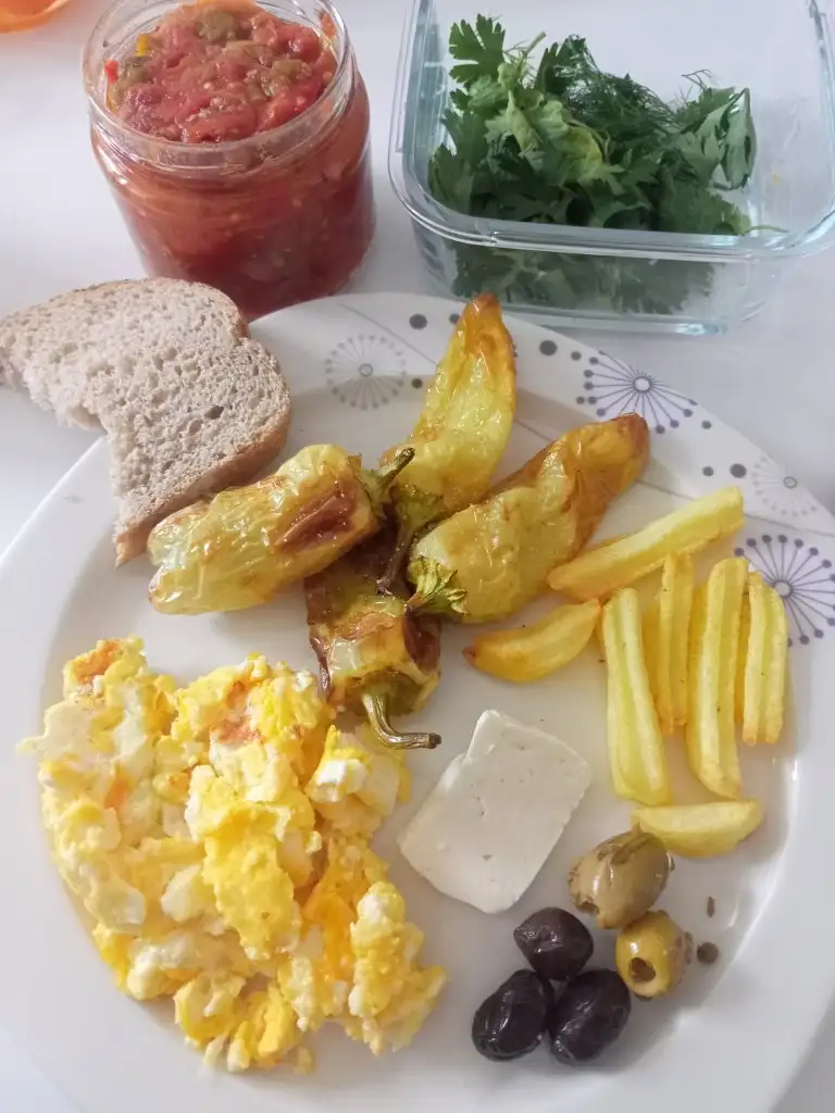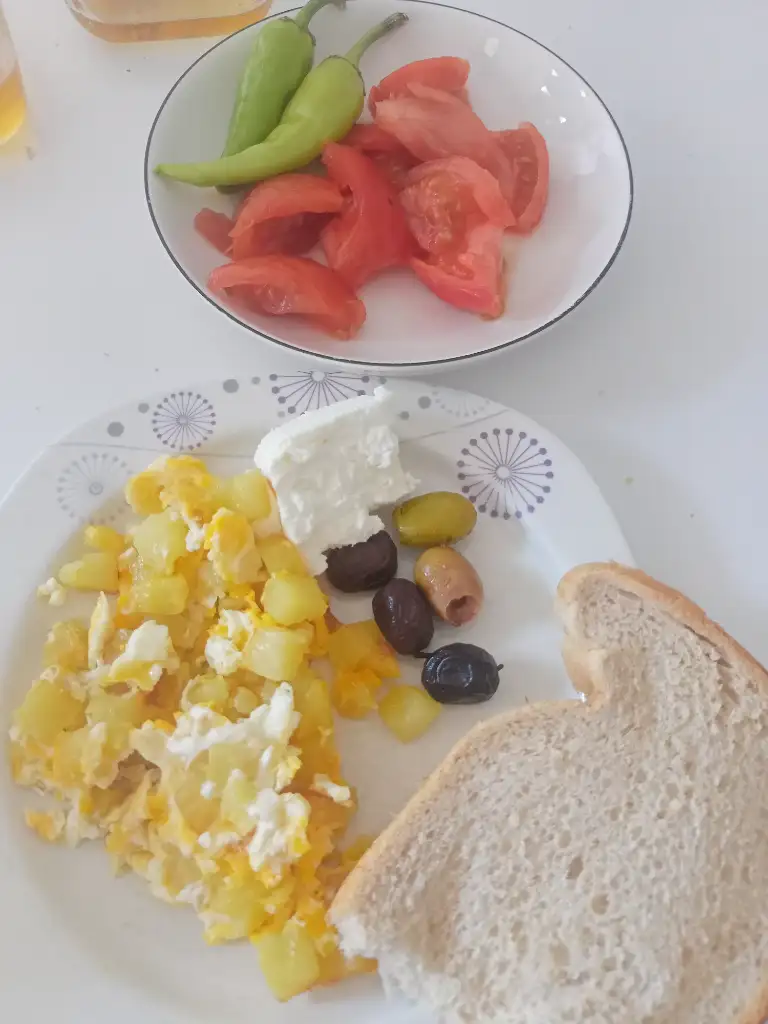 Sabah kahvaltida 2.5 dilim ekmek, menemen , yesillik, 1 dilim peynir, 3 zeytin, 3 catal tatli yedim