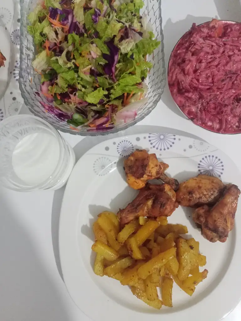 Aksam yemegime ek olarak 1 buyuk kanat yedim 3 kucuk dilimde patates yedim