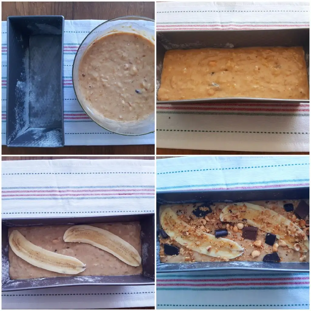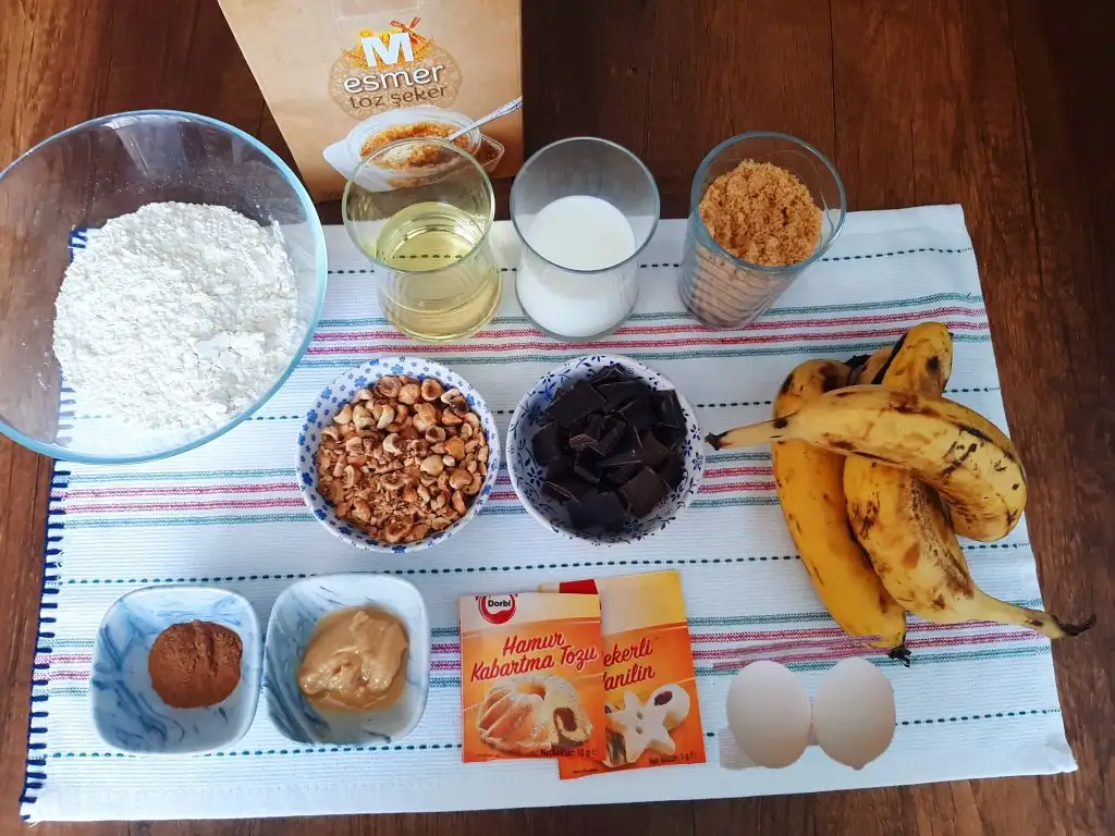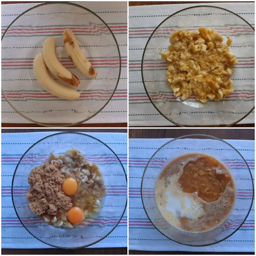 3 adet olgunlaşmış muz kaseye alınır. Muzlar ne kadar olgunlaşmış olursa tadını o kadar iyi verecektir. Kaseye alınan muzlar çatal yardımıyla ezilir. Daha sonra oda sıcaklığındaki 2 yumurta ve esmer şeker eklenerek ezme işlemine devam edilir. Katı malzemelere geçmeden karışıma son olarak süt ve yağ eklenir.