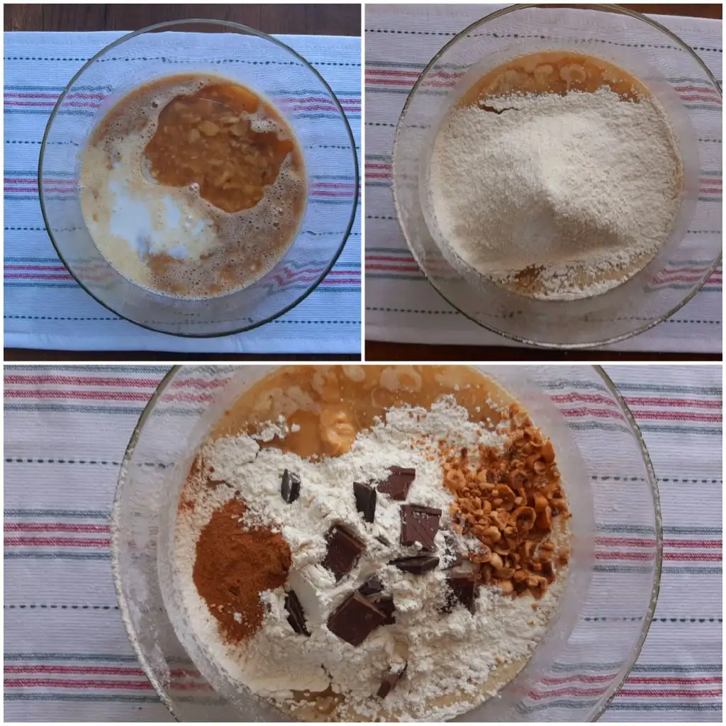 2 su bardağı un, kabartma tozu ve vanilya karıştırıldıktan sonra elekten geçirilerek karışıma eklenir. 1 tatlı kaşığı fıstık ezmesi, 1 çay kaşığı tarçın, dövülmüş fındıklar ve doğranmış çikolatalar da malzemelere eklenerek spatula yardımıyla karıştırılır. Un eklendikten sonra çok hızlı karıştırılmamalıdır.