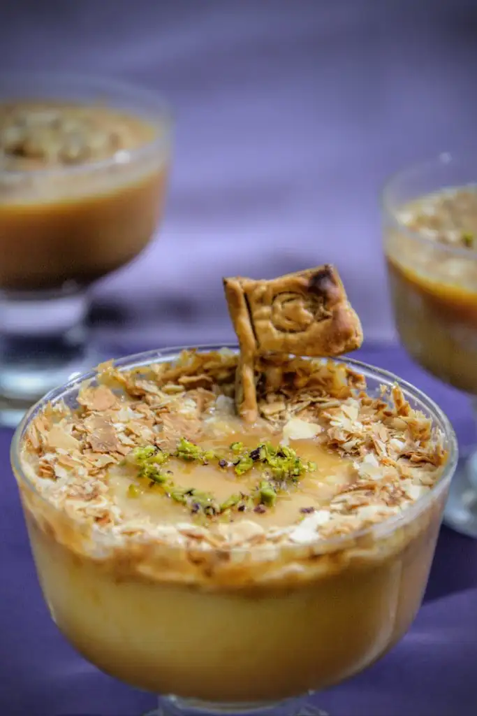 1. Önceden ısıtılmış fırında pişirilmiş milföy hamurları parçalanır ve üstüne konularak servis edilir.