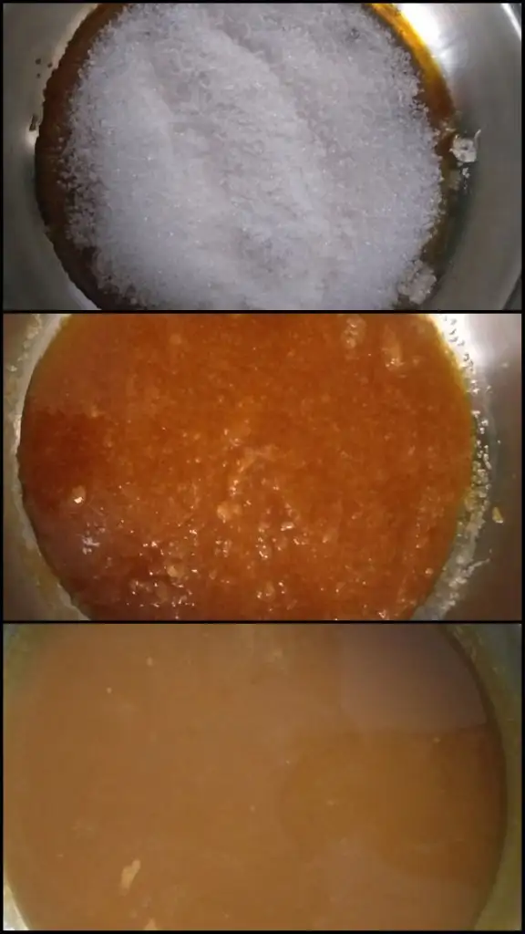 1. Çelik tava veya tencereye şeker konur ve karıştırmadan bekletilir. Ocağın altı kısık olmalı yoksa yanar. Yarısı eriyince altı kapatılır ve karıştırılır.