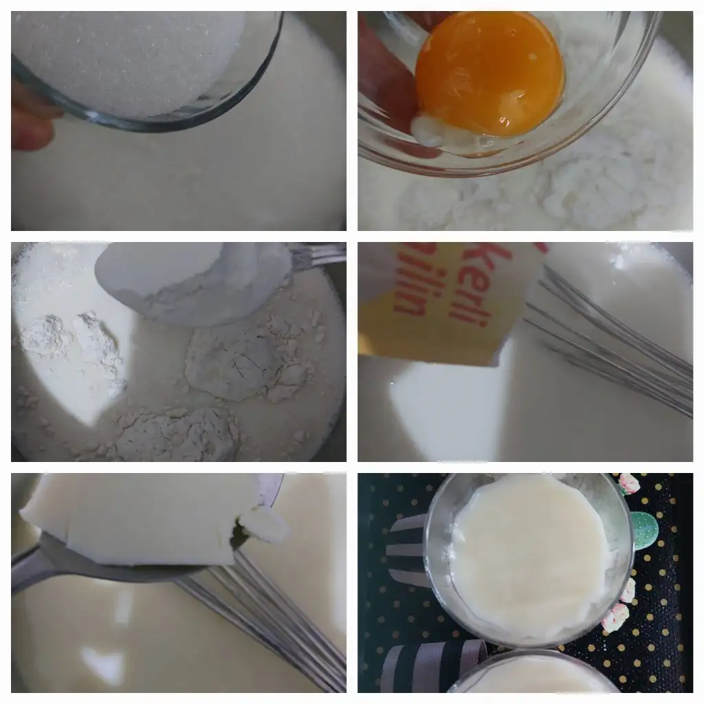sütü tencereye alalım. İçine vanilya ve tereyağı haric tüm malzemeleri alalım. Kaynayana kadar surekli karıştıralım. Kaynayinca vanilya ve tereyag ekleyip eritelim. Kaselerimizin yarisina kadar dolduralım.