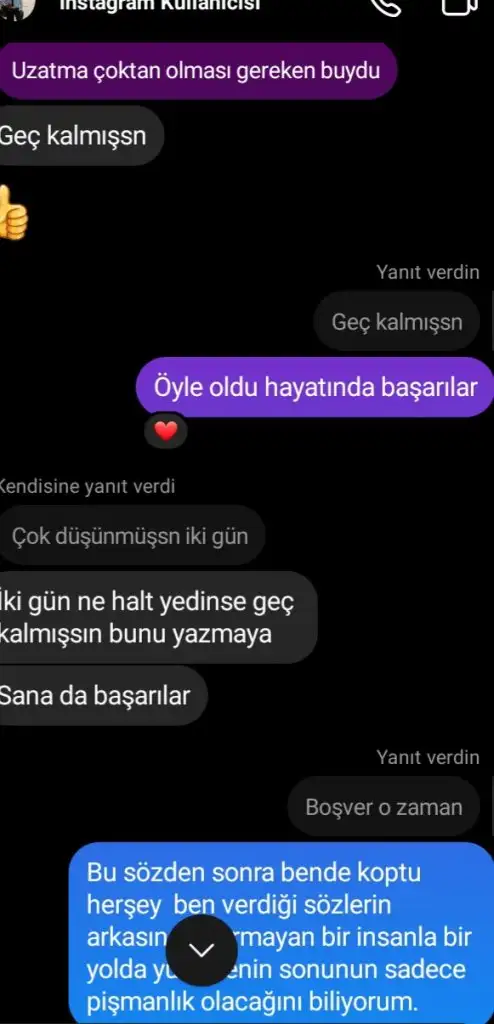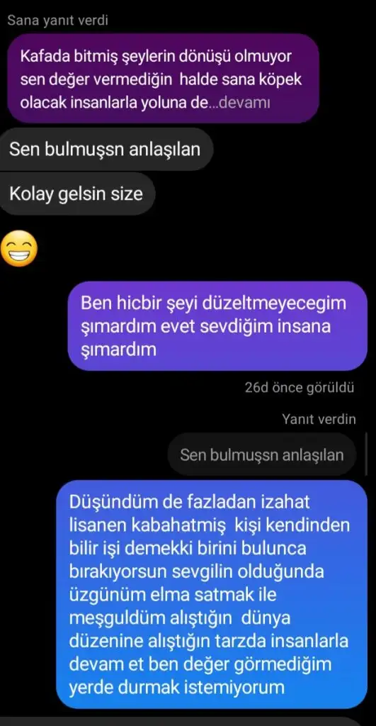 Arkadaşım adına açıyoruz konuyu görüşleriniz onun için önemli ben söyledim ikna olmadı birde sizin yazdıklarınızı okusun belki ikna olur :) dün bir aydır sevgili olduğu çocukla konuşuyormuş bir kez buluşmuşlar çocuk normalde canim cicim yapıyor vs herşey güzel bugun buluşacaklarmış, dün sevgiliyle herşey güzel konuşurken yarın bir aktivite bul yapalım diye msj atmış birlikte zaman gecirelim diye :) adam da demiş ki eğlenecek başka birşey bul özledim diyorsun bunlardan konuşuyorsun vs demiş sonra konuşmadan uykum var kafam almıyor ben uyuyorum demiş uyumuş kızın msjina cevap vermemiş( bence bahane bulmuş zaten dengesiz biri anlattığına göre ) adama şu msjı yazmış bence bana ve bu ilişkiye değer vermiyorsun demiş. Adam da boşver o zaman demiş ve attığı msjı beğenmiş ve arkadaşım da tekrar sonuç yazmış cevap alamamış bir de üzerine bulusacakmiyiz yazmış adam yine cevap vermemiş ( ayrılmaya bahane arıyor bence bu da usteliyor) arkadaşım 24 bu adam da 26 yaşında ama anlattığına göre ergen kafasında bence olmaz bundan adam ama sizce cevaplarınız onun için kıymetli. ( bu arada adam geçen hafta buluşacakken de ekmiş )
