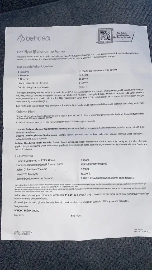 Merhaba bu fiyat berfu hocanın mi acaba ?Çok sağolun bılgı ıcın. Güncel fiyat tedavı ücreti 79 bin tl, rahim dinlendirme 14.400tl embriyo dondurma 18 bin tl ilaçlar 25 30 bin arası genetık 325 Euro Dondurulmuş tedavisi 39.500 tl fiyatları böyleymiş