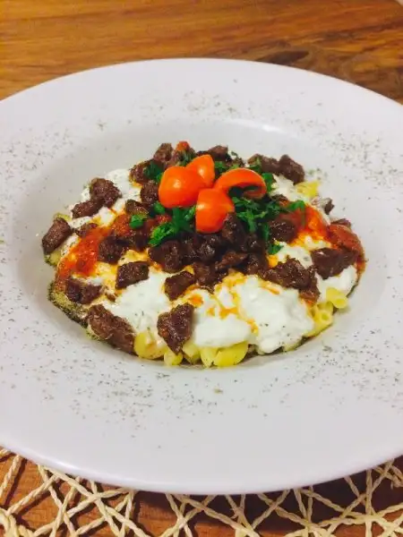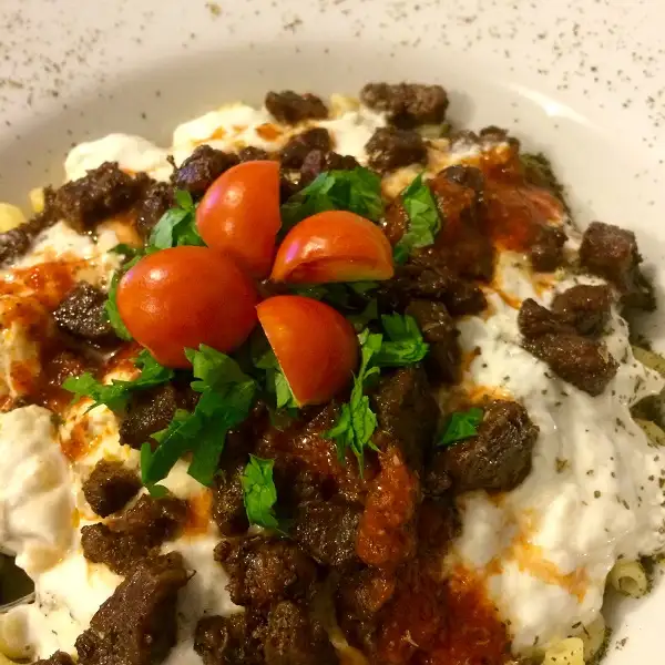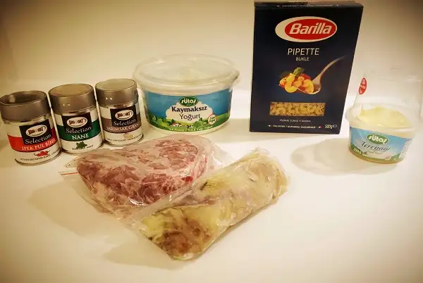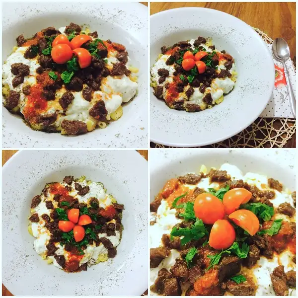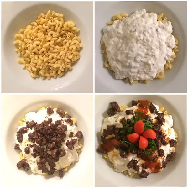 En son makarnanın üzerini komple patlıcanlı yoğurt, üzerine kavurma etler ve en üste de salçalı sostan gezdirip tamamlıyorum.
