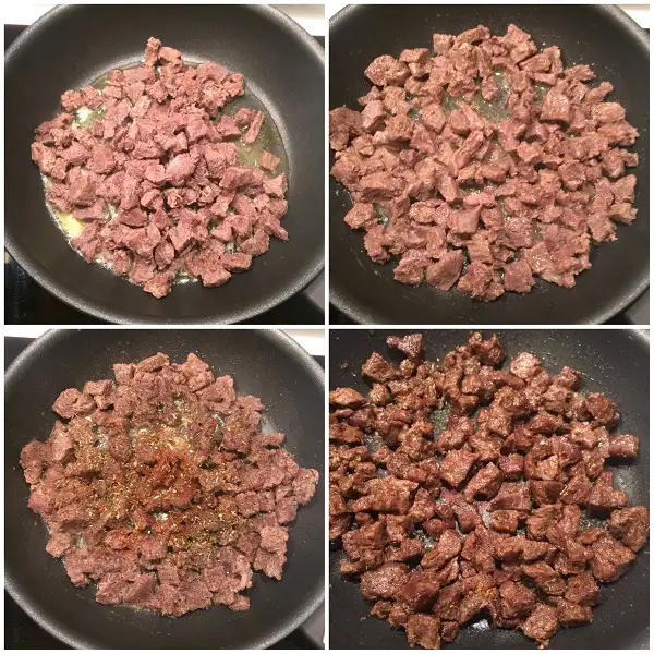 Daha sonra haşlanmış eti, biraz tereyağ ve zeytinyağıyla baharatlayıp (kekik, pul biber, kırmızı biber, karabiber, tuz) kavurdum.