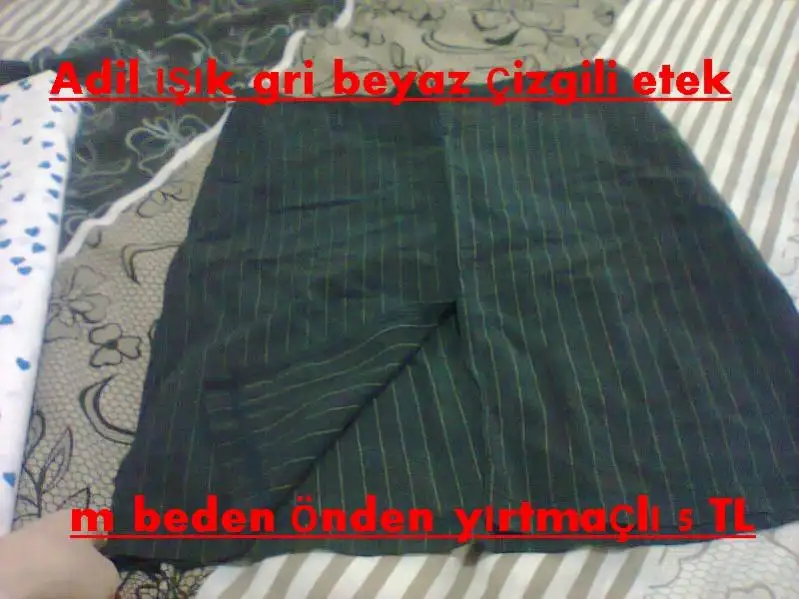 Eki Görüntüle 1014135 Eki Görüntüle 1014126 Degaje yaka bluz m beden 5 TL (burdan aldım bana biraz bol ) Adil ışım gri beyaz çizgili etek m beden önden yırtmaç detaylı 5 TL