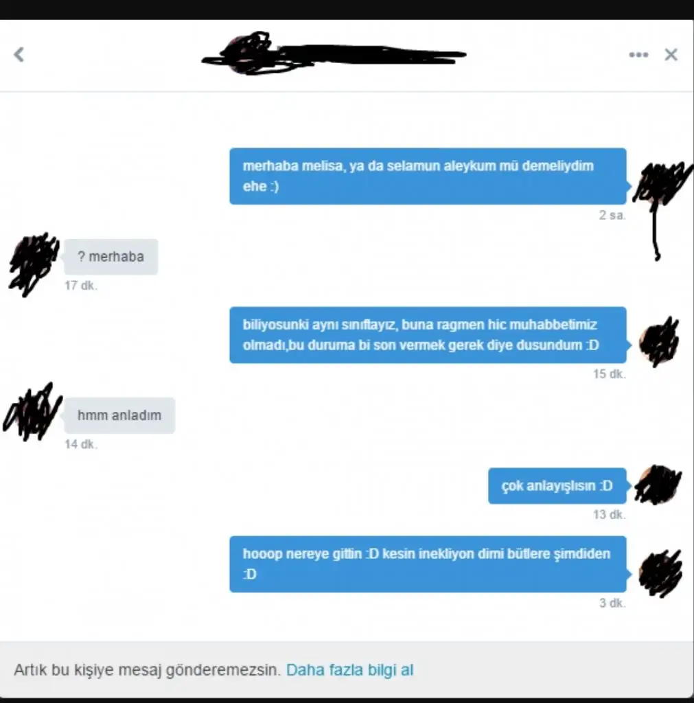 İlk mesajınız bekar mısın olsun lütfen burda o kadar çok evli erkeklerin ağına düşen gördüm ki bekarlığından emin olunMerhaba acil fikir almam gerek sizden. Şimdi özet geçiyorum oturduğum yere yarın ilgimi çeken bi bey var. Çok az karşılaştık tanımıyorum bikaç kere gördüm sadece. Ama aşırı derecede tanımak istiyorum. Kendisinin bana sosyal medyada istek atmasıyla varlığından haberim oldu. Ama şöyle, istek atıyo sonra geri çekiyor. Şimdi yine uzun aradan sonra yine aynı şeyi yaptı. Muhabbet açmak istiyorum onun için niye böyle bişey yaptığını sormam gerek sanırım. Ne yazmalıyım ilk mesaj olarak bana yardımcı olun :/.illa bişeyler olmasına gerek yok ama kendisini saçma Bi şekilde çok merak ediyorum.