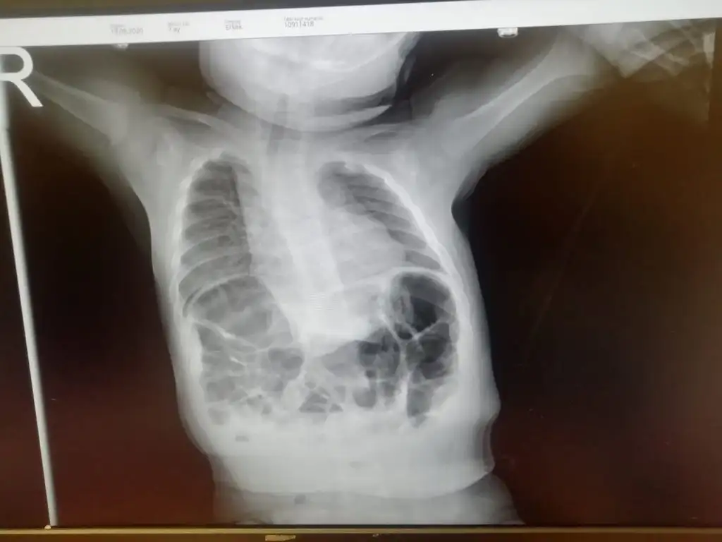 şimdi Cansu hanım bu filme bakarak net bir şey söyleyemem ancak çocuğun sağına bakarsanız bağırsakların orada olmaması lazım yani karaciğer seçilemiyor maalesef, buna bağlı olarak diyaframa barsak fıtıklaşmış ve oradaki akciğer alanını söndürmüş olabilir. ( yine dikkatli bakarsanız soluk borusu da sağa itilmiş zaten orta hatta olması gerekirken) Buna atelektazi diyoruz, buna bağlı olarak da sık enfeksiyon ve nefes darlığı görülebilir.