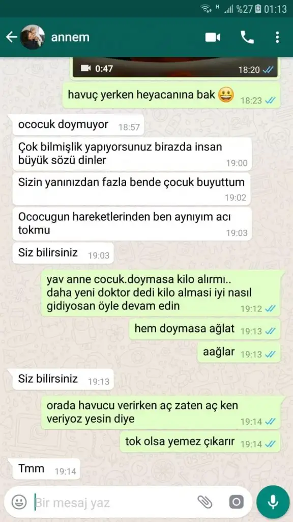 Neyse bu sinirlendi falan eşim de buna sinirlendi uzattıkça kapattılar, düşünün kadındaki baskıcılığı. Hani benim annem de böyle şeyler söylüyor klasik anneler işte ama açıkladığımda tamam deyip geçiyor ama bu iğrenç yaratık kilometrelerce öteden çocuğuma karışmak istiyor her şeye karışmak istediği gibi ve bunun gibi basit bir mesele için kavga çıkarıyor. Neyse bunlar kapattı, sonra eşim mesajlaştı falan gördüm ve gerildi baya. Anladım arkamdan konuştuğunu o Allahın cezası kadının yine, huzur bozmadan duramaz zaten. Eşimin teline baktım Allahım ne hakaretler bana! Eşim benden korkuyormuş, ben kim oluyormuşum, çocuk bakmaktan ne anlarmışım, pislikmişim, gelin mi almış bela mı almış (laflara bak), baktığım çocuk ortadaymış, çocuğa katı gıdalar veriyormuşum o onları sindiremezmiş o yüzden kilo almıyormuş (bebek 1 yaşında bu arada!), İnternet annesiymişim bütün dünyam İnternetmiş, ha bi de en komiği odanın kapısı hiç kapanmıyormuş çünkü ben oradan dinliyormuşum telekulak gibi! Evimde kapılar kapalı durmaz bu arada, ne münasebet sen kimsin ki kapı kapatıcam ruh hastası ya.