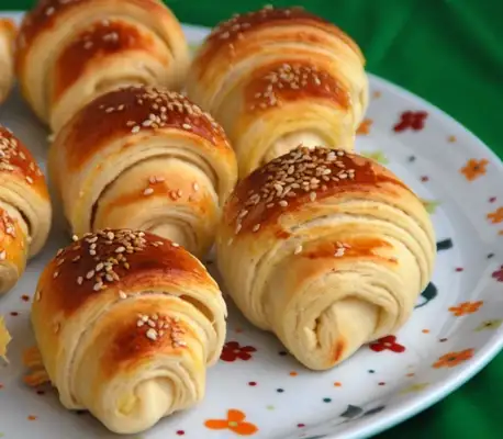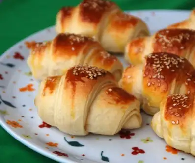 Mayayı yarım çay bardağı ılık suda eritin. Diğer malzemeleri de ekleyerek hamuru yoğurun. 8 bezeye bölüp, her bezeyi tabak boyutunda açın. Açtığınız hamurların arasına yumuşak tereyağından sürerek üst üste dizin ( en üste tereyağ sürülmeyecek sadece hamurların aralarına sürülecek). Üst üste dizilmiş hamurlar büyükçe açılır. Hamuru pizza dilimi şeklinde kesin. Benim hamurum 18 dilim olacak şekilde kesildi. Hazırlamış olduğunuz iç harçtan koyarak sigara böreği sarar gibi hamuru çok sıkmadan sarın. Yağlı kağıt serilmiş ya da yağlanmış fırın tepsisine dizin.Yarım saat tepside mayalanmasını sağlayın. Üzerlerine yumurta sarısı sürün, susam serpin. 180 derece fırında altı üstü kızarana kadar pişirin. Afiyet olsun.