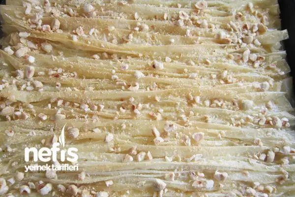 Baklava yufkasını kısa tarafı bize doğru gelecek şekilde tezgaha seriyoruz, fırçayla yağlıyoruz ve her tarafına gelecek şekilde irmik serpiyoruz. İki ucundan büzüştürüyoruz fırın tepsisine dikkatlice koyuyoruz. Diğer yufkalara da aynı işlemi yapıyoruz. Fırına veriyoruz, 180 derecede pişiriyoruz. Diğer tarafta sosu hazırlıyoruz. Yumurta ve şekeri iyice çırpıyoruz, sıvı yağ ve sütü ekliyoruz. Kabartma tozunu da ilave edip karıştırıyoruz. Fırındaki tatlımız hafif pembeleşince çıkarıyoruz ve bu sosu her yerine döküyoruz. Fındık kırığını serpiyoruz ve tekrar fırına veriyoruz. İyice kızarınca fırından çıkarıyoruz ve 5 dk sonra soğuk şerbeti her yerine döküyoruz. Üzerini kapatmadan şerbeti çekmesi için bekliyoruz.