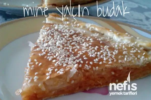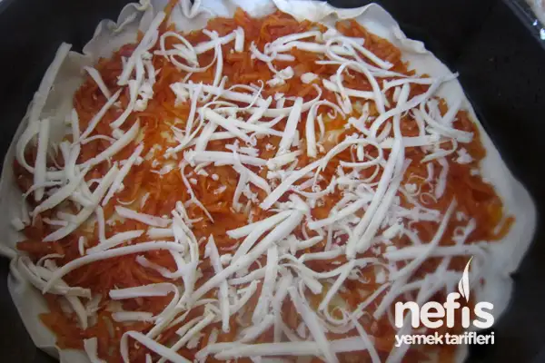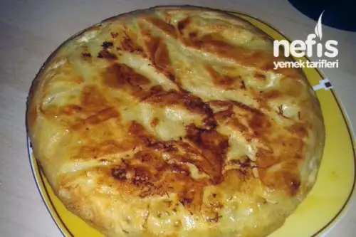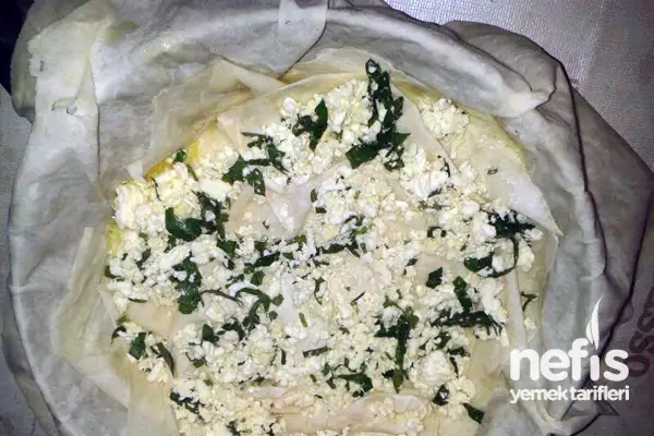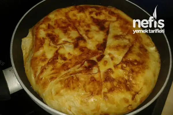 Tavanın dibi margarinle yağlanır sonra bütün bir tane yufka tavanın dibine büzülerek yerleştirilir. Birazi dışarı sarkması lazım. Arasına çırpılmış sos yayılır. Diğer yufkanın yarısı parçalara ayrılıp tavaya döşenir. Üzerine peynir, maydanoz karışımı serpilir. Diğer yarım yufka da aralarına sos dökülerek yerleştirilir. En son sarkan yufka üzerine kapatılıp kalan sos dökülür, dinlendirilir. Ben bir gece beklettim, tava kısık ateşe konulup kapağı kapatılır. Arada kontrol ederek altının kızarması beklenir. Alt taraf kızarınca ters çevrilip diğer tarafı da kızartılır, biraz soğuduktan sonra servis edilir.