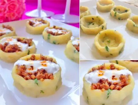 Patateslerden mandalina büyüklüğünde parçalar kopartıp ortasını çanak şeklinde çukurlaştırıyoruz. Kıymalı harcımızı tatlı kaşığı ile patateslere eşit miktarda pay ediyoruz. Daha sonra sarımsaklı yoğurdu üzerlerine döküp tavada erittiğimiz tereyağı ve pul biber karışımı ile süslüyoruz.