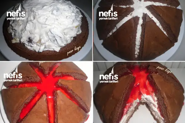 İlk önce meyve sosunu tarifindeki gibi hazırlayıp soğumaya bırakıyoruz. Daha sonra krem şantiyi sütle çırpıyoruz içine halleyi ya da bisküviyi ( ben halley kullandım ) parçalara ayırıp ekliyoruz. Muzu doğruyoruz ve şantiyle harmanlıyoruz ( isterseniz içine damla çikolatada ilave edebilirsiniz ben sevmediğim için kullanmadım ). Sonra pasta tabanının tekini 8 eşit parçaya bölüyoruz diğerininde üzerine kaşıkla süt döküp ıslatıyoruz ve ortasına kubbe olacak şekilde hazırladığımız harcı dolduruyoruz kenarlardan biraz boşluk bırakarak dolduruyoruz. Üçgen şekilde kestiğimiz kek dilimlerini biraz sütle ıslatıp eşit bir şekilde pastamızın üzerine diziyoruz. 1 parça artıyor 7 parça tam geliyor. Üzerine de meyve sosunu döküp servis yapıyoruz. Ben dolapta bekletmedim isterseniz bekletebilirsiniz. Krem şanti yerine pasta kremasıyla da yapabilirsiniz. Üstüne meyve sos yerine çikolata sosu da dökebilirsiniz .
