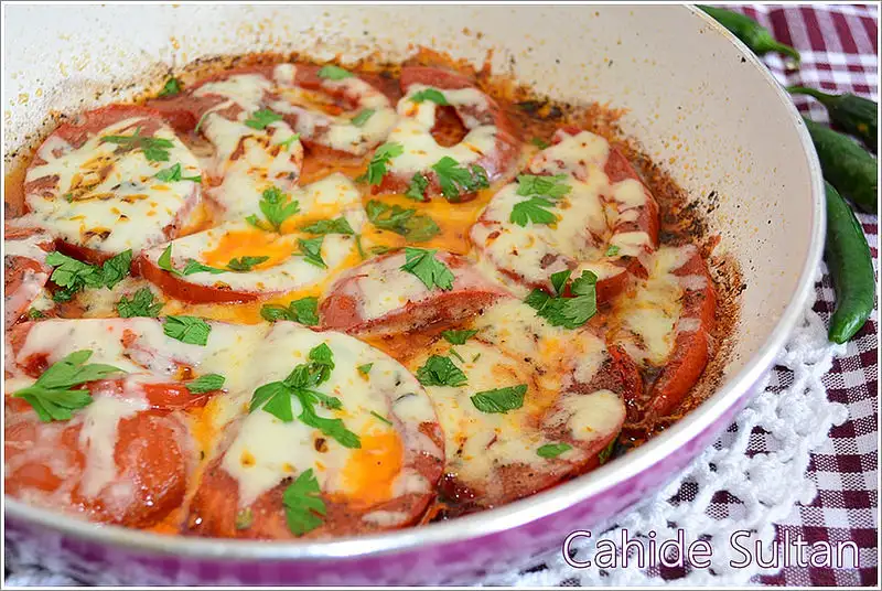 • Domatesleri kalın yarım ay şeklinde doğrayıp tavaya dizin.