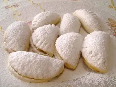 Hazırlanışı Harcı için;elmaları soyup rendeleyin.1 çay bardağı şekeri ekleyerek kısık ateşte pişirin.Soğuyunca dövülmüş ceviz ve tarçını ilave edin.Oda sıcaklığındaki yağı ve pudra şekerini bir kapta karıştırın. Üzerine yumurta, yoğurt, kabartma tozu, vanilya ve unu ilave ederek yumuşak kıvamda bir hamur yapın.Sonra hamuru merdane yardımıyla açıp bardak ile keserek yuvarlak hamurlar elde edin.Yapmış olduğumuz harcı yuvarlak hamurların ortasına koyarak ay şekli verin isterseniz hamuru büyük bir daire(yaklaşık 20cm çapında) şeklinde açarak pizza dilimi şeklinde kesin ve harcı geniş olan kısma koyarak rulo yapın.180 dereceli fırında 30 dakika pembeleşene kadar pişirin.Üzerine pudra şekeri dökerek servis yapın.Afiyet olsun.