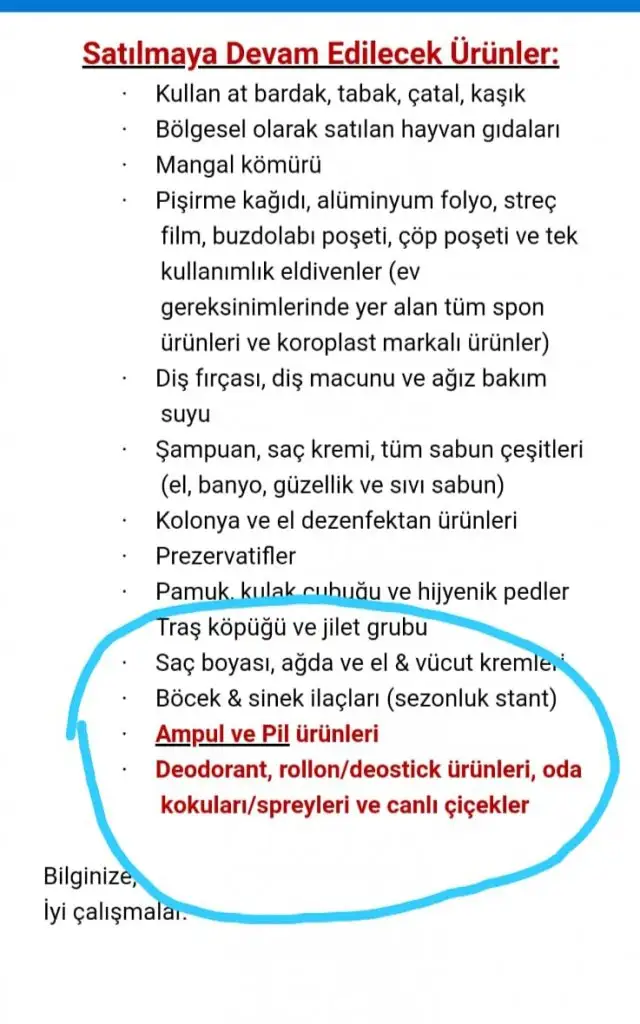 "Sabun, hijyenik ped ve ev temizlik ürünleri (deterjan vs)yle ilgili herhangi bir kısıtlama ise genelgede net olarak yer almıyor."