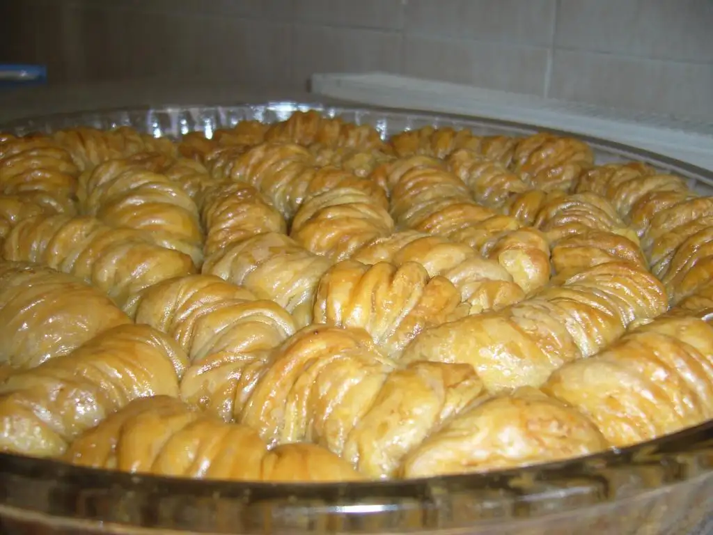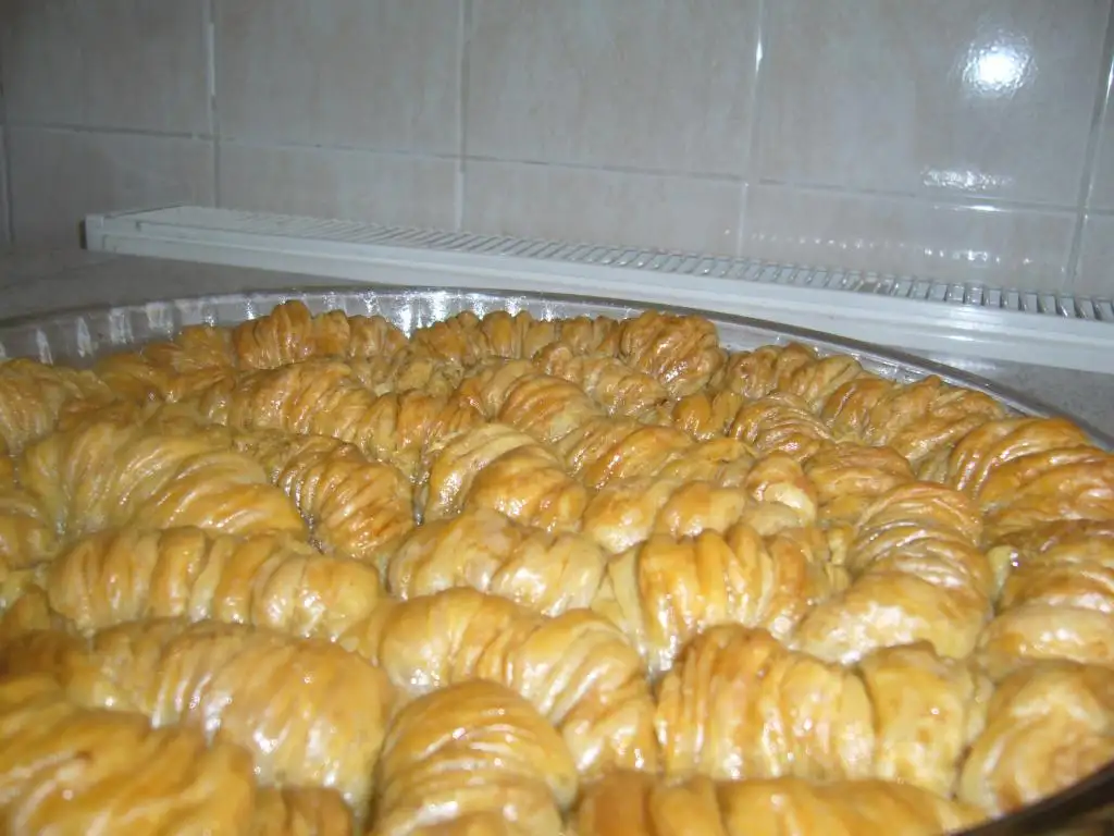 YAPILIŞI Hamur yapılır çok sert olmayacak nekadar yumuşak olsa okadar iyi açılır...Ceviz büyüklüğünde 70-80beze alınır..Onlar 5er-6şar küçük servis tabağı kadar nişastayla açılır..üst üste konur sonra büyütülür....Üzerine ceviz serpilir..Ortadan ikiye bölünür....ikiside ayrı ayrı oklavaya sarılıp büzülür,tepsiye dizilirÜzerine 1 paket margarin,1su bardağı sıvıyağ karıştırılıp dökülür..ve 175 derecede pişirilir....üzerine 6 bardak şeker,5 bardak su 1-2 damla limon kaynatılır..ve tatlı soğuk şerbet ılkıkken üzerine dökülür...AFİYET OLSUN...