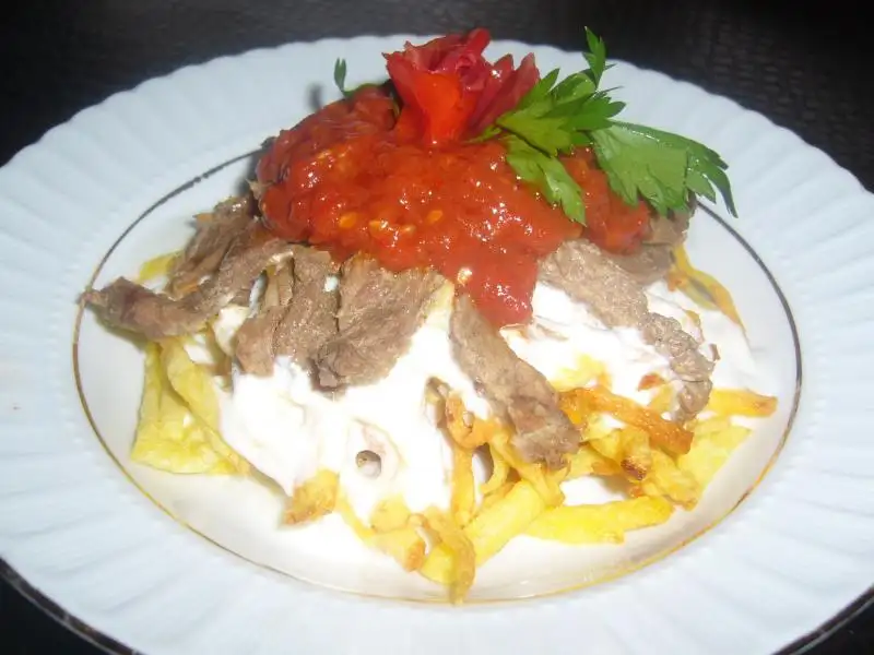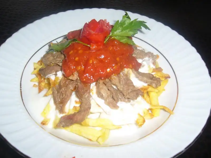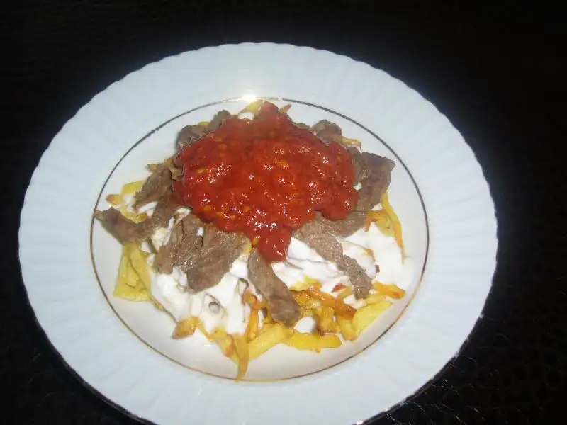 Daha sonra patatesler servis tabağına alınır.Üzerine sarmısaklı yoğurt eklenir..üzerine pişirilen etler dizilir ve domates sosu eklenerek servis yapılır...Afiyet olsun:56::56: