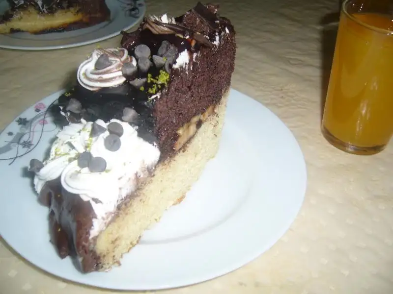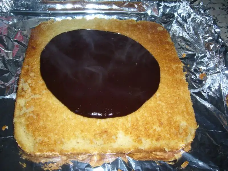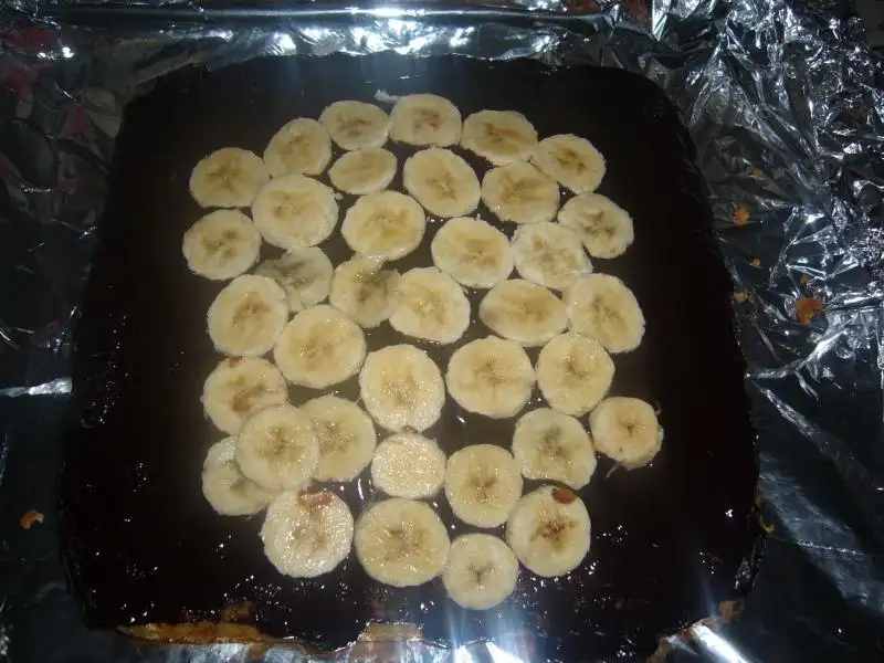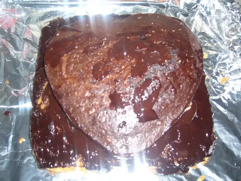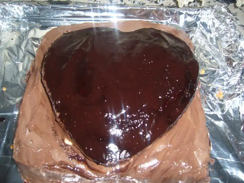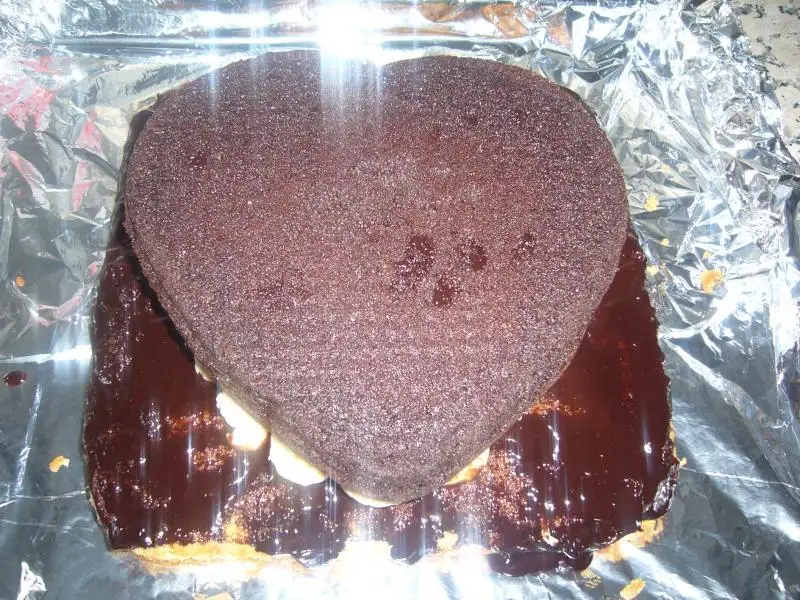 Kare kek tepsiye ters çevrilip üzerine çikolata sos sürülür orta kısmına muzlar dizilir..Sonra kalp kek üzerine yerleştirilir ve çikolata sos dökülür ..