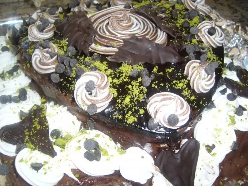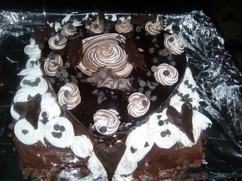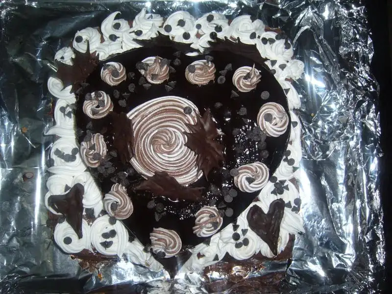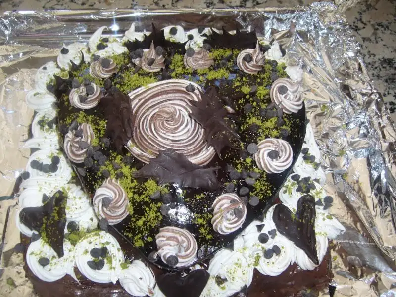 Kalp pastanın üzerine beyaz kremşanti sonrası pasta şırıngasına kakaolu pasta kremasını doldurunca bu şekilde iki renkli bir şekil oluştu..Üzerine antep fıstığı ,damla çikolata ve dondurduğumuz bitter çikolatalar ile süslenir...