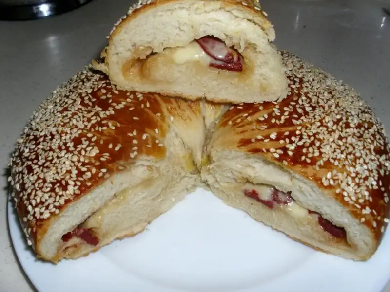 Tezgahı unlayıp hamuru çok ince olmayacak şekil de açıyoruz. Ortaya uzunlamasına sucuk ve kaşarı koyuyoruz.