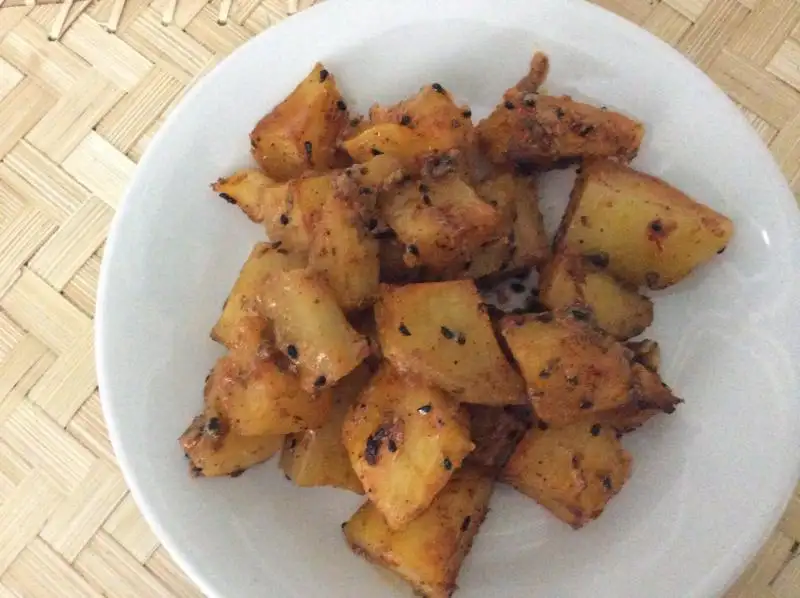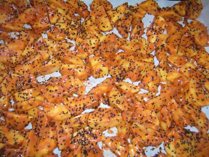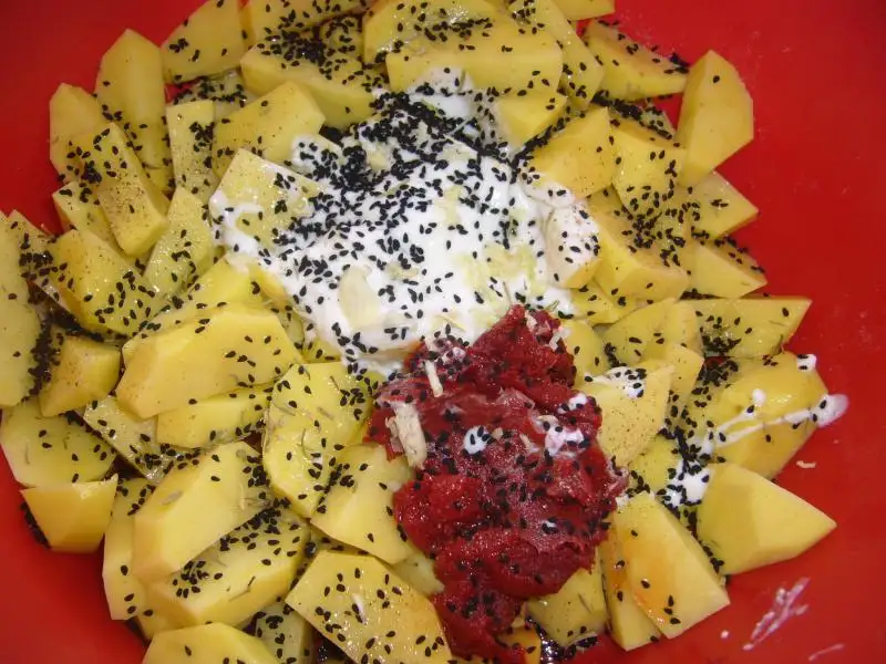 Patatesler soyulur ve çok küçük olmayacak şekilde doğranır.Üzeine tüm malzeme eklenip(çörek otu dahl) karıştırılır..Sonra yağlı kağıt serilmiş tepsiye patatesler konup üzerine tekrar çörek otu eklenir...175 derecede patatesler pişene kadar pişirilir...Afiyet olsun:))