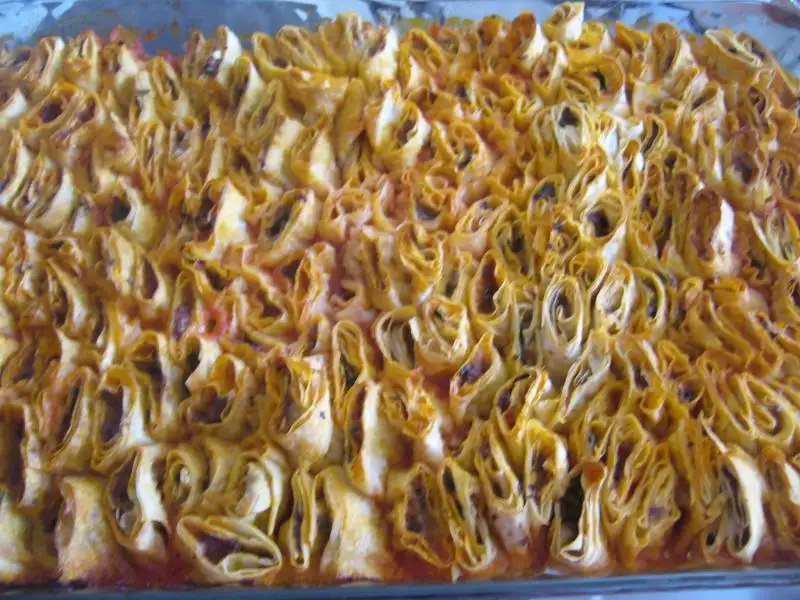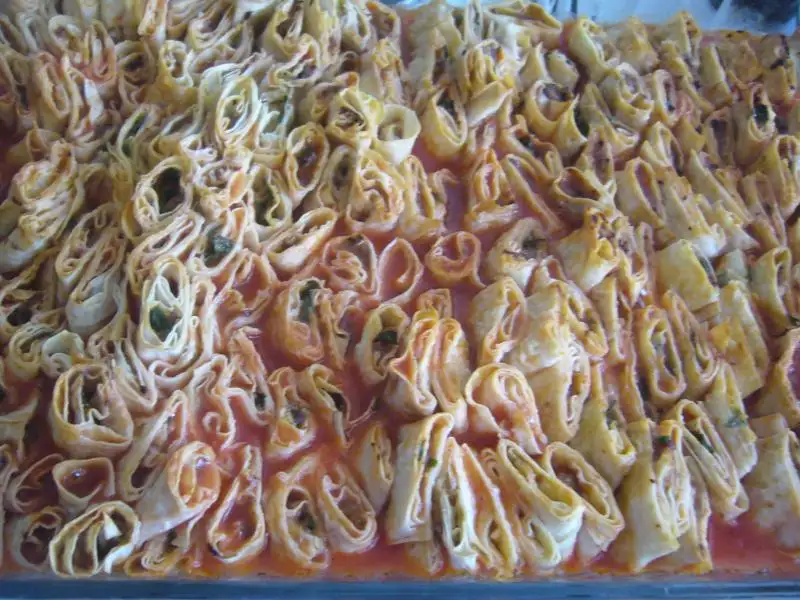 Soğanı rendeleyelim, sarımsakları dövelim. Kıyma, tuz, karabiber, pul biber, soğan ve sarımsağı yoğurup iç harcımızı hazırlayalım. Yufkanın üzerine ayran ve sıvıyağ karışımını sürelim..Yufkayı ortadan ikiye keselim. Bir parçayı alıp kıymayı kol böreği yapar gibi sarıp yufkayı rulo şeklinde saralım. ruloyu 2 cm kadar kalınlıkta dilimleyip yağlanmış fırın tepsisine fotoğraftaki gibi dizelim. Bütün yufkaları aynı şekilde hazırladıktan sonra tepsiyi fırına sürelim. 20 dk kadar fırında kızartalım. Daha sonra fırından alalım. Üzerine ayrı bir yerde yağ salça kavurup 3 su bardağı su ekleyip kaynatalım, suyu fırın tepsisine gezdirelim. Tekrar fırına sürüp 10-15 dk kadar suyu çekmesini bekleyelim. Sarımsaklı ya da sarımsaksız yoğurt ve tereyağlı pulbiberli sos ile servis yapalım.