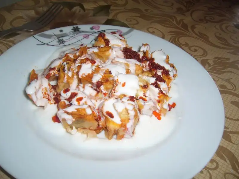 üzerine: sarımsaklı yoğurt ve tereyağlı pulbiberli sos