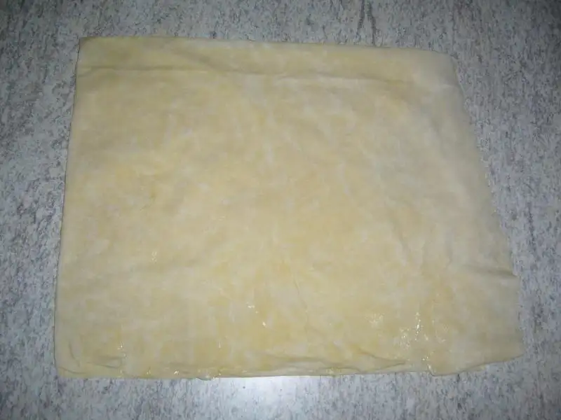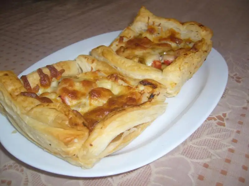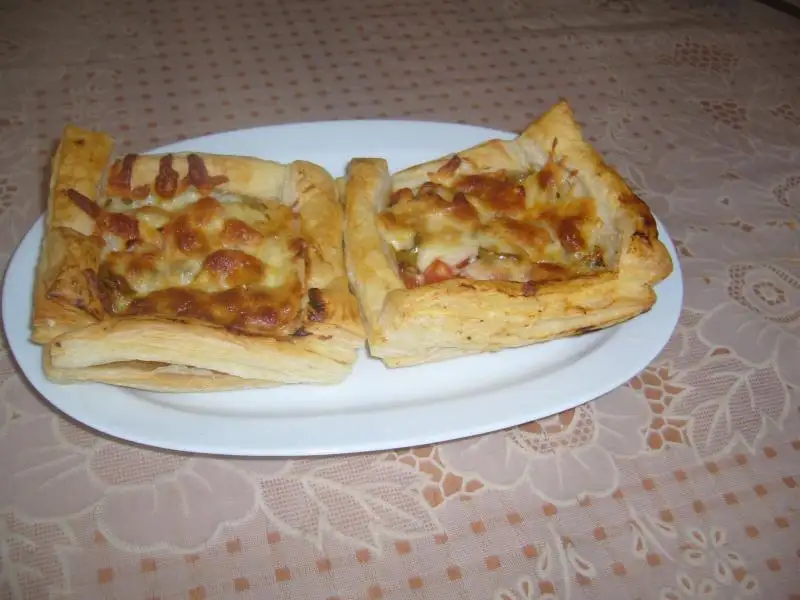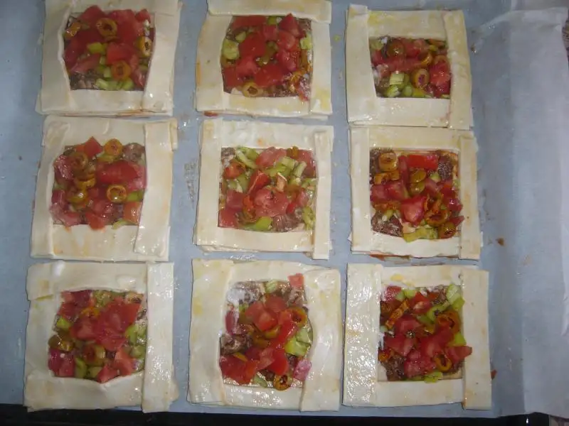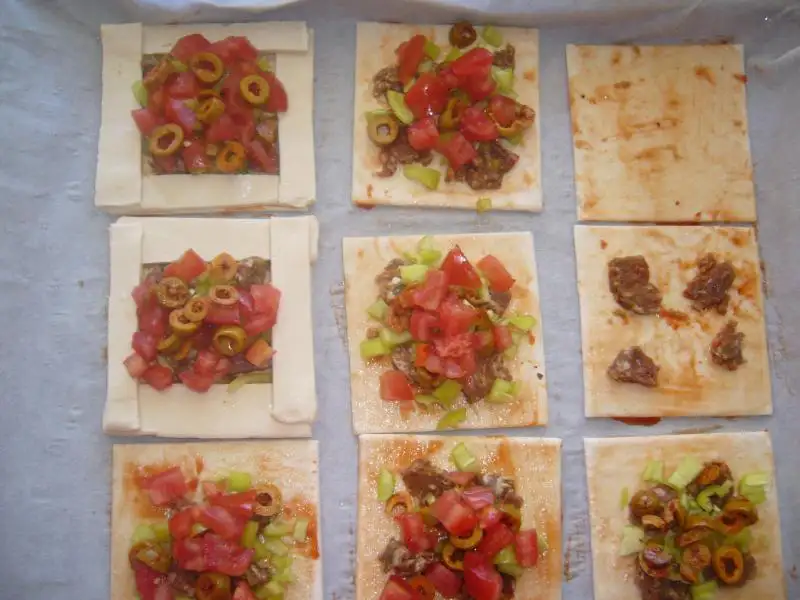 Yağlı kağıt serilmiş tepsiye 9 adet milföy dizilir..Üzerine fırça ile ketçep sürülür...Sonra malzemeler istenilen şekilde dizilir(kaşar hariç).Diğer 3 adet milföy ince şeritler halinde kesilip 4 tarafa eklenir...Sonra kenarlarına yumurta sarısı sürülür(benim yoktu yoğurt sürdüm çok kızarmadı)