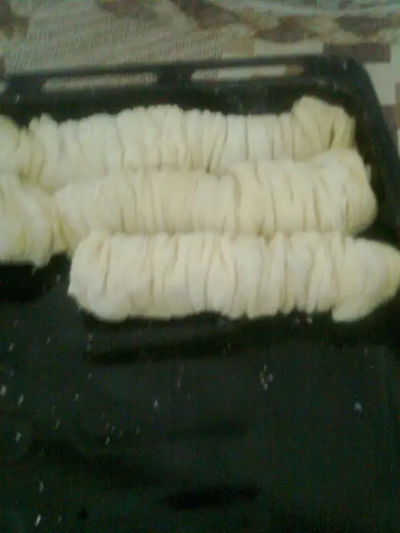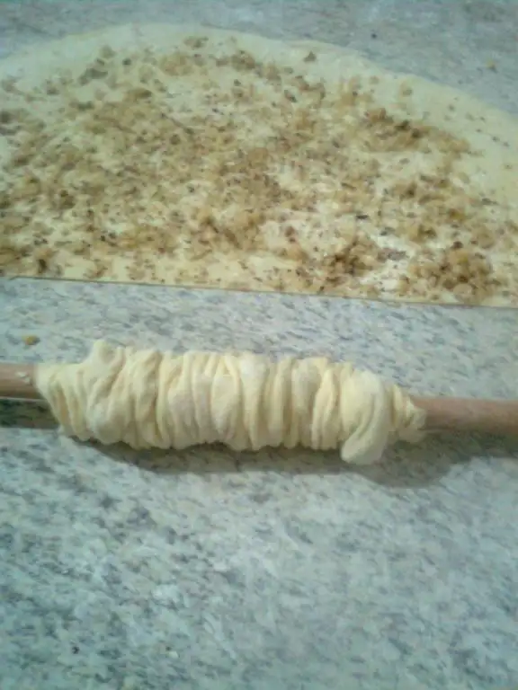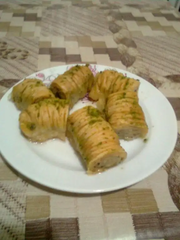 Hamur yapılır çok sert olmayacak nekadar yumuşak olsa okadar iyi açılır...Ceviz büyüklüğünde 50-60beze alınır..Onlar 5er-6şar küçük servis tabağı kadar nişastayla açılır..üst üste konur sonra büyütülür....Üzerine ceviz serpilir..Ortadan ikiye bölünür....ikiside ayrı ayrı oklavaya sarılıp büzülür,tepsiye dizilirÜzerine 1 paket margarin,1su bardağı sıvıyağ karıştırılıp dökülür..ve 175 derecede pişirilir....üzerine 6 bardak şeker,5 bardak su 1-2 damla limon kaynatılır..ve tatlı soğuk şerbet ılkıkken üzerine dökülür...AFİYET OLSUN...