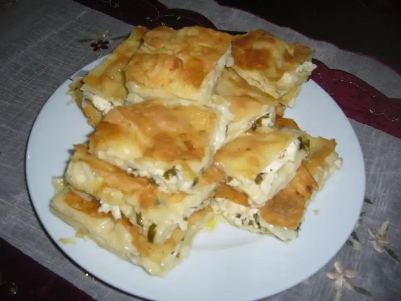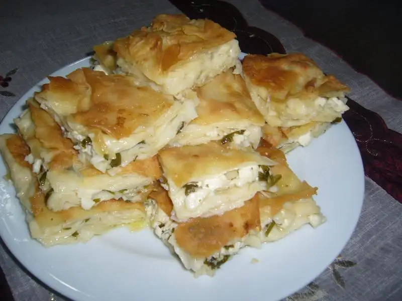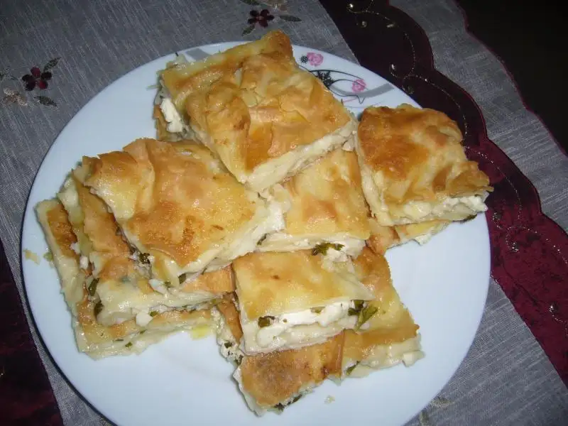 Yumurta,yoğurt,yağ,tuz,un karıştırılarak kulak memesi kıvamında hamur yapılır...Hamur 15-20 dakika yoğrulmalı..Sonra eğer tepsi büyükse 10 beze alınır..Daha küçükse 12 beze alınır...Bezelerin üzeri nemli bir bez örtüp 10 dk.Dinlendirdikten sonra açmaya başlıyoruz.....Açtığımız hamurlarımızı seriyoruz.Üstüste gelmesi önemli değil.Dağınık olarakta mutfak tezgahına veya sofra bezine serebilirsiniz.Bütün hamurları açtıktan sonra haşlamaya geçiyoruz..... Büyük bir tencerede kaynattığımız suyumuza 1 tatlı kaşığı tuz ve biraz yağ akıtıyoruz.Kaynayan suyun içine yufkaları atıp haşlıyoruz..Sonra haşlanan yufkaları soğuk su dolu bir leğenin içine alıyoruz.Elimizle yufkayı açtırıp suyunu sıkarak tepsiye alıyoruz. Yufkanın birisini tepsinin altına serip yufkayı yağlıyoruz.Üzerine haşladığımız 4 yufkayı aralarını tereyağı ile yağlayarak seriyoruz.Bu şekilde yufkaları döşedikten sonra tam ortasına içimizi yayıyoruz... Sonra geri kalan 5 yufkayıda haşlayıp aralarını yağlayarak döşüyoruz.En üstüne kuru bıraktığımız yufkayı serip üzerini yağladıktan sonra.Doğru fırına... Fırınımızın ayarını çok fazla yapmayın.Ağır ağır pişirin daha güzel olur.. Böreğimiz nar gibi kızardıktan sonra üzerine tepsi kapatıp 5 dk.dinlendiriyoruz.Sonra üzerini açıp dilimleyip servis yapıyoruz.....AFİYET OLSUN..........