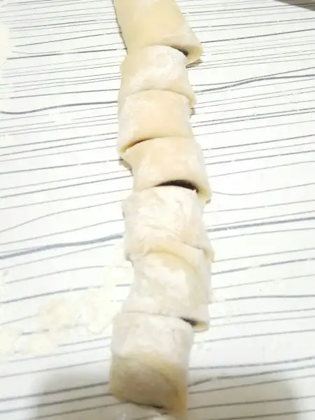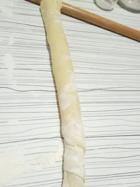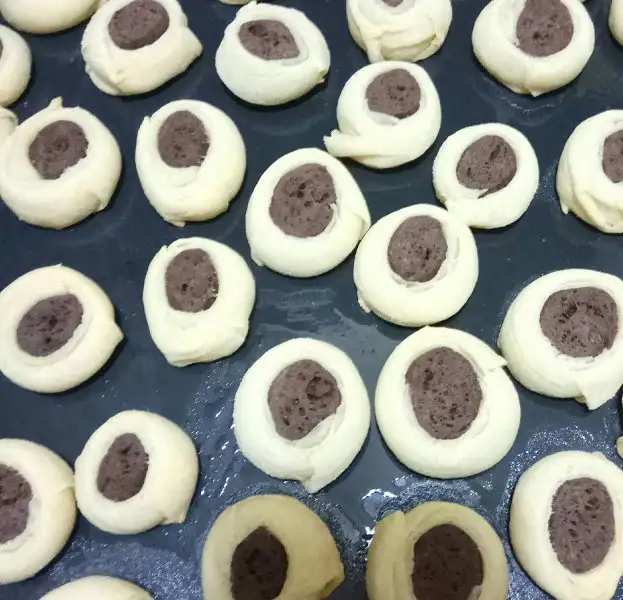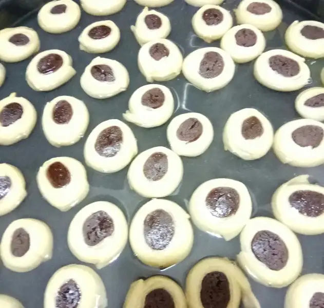 Daha sonra beyaz olan bezeler sırayla altı ve üstü unlanarak oklavayla açılır, kakaolu olan bir beze elinde uzun şekilde yuvarlanır açılan hamurun üzerine konur ve rulo şeklinde yuvarlanır ve daha sonra 2 parmak kalınlığında kesilir. Kesilen bu hamurlar kakaolu kısım üstte kalacak şekilde bastırılır ve yağlanmış tepsiye dizilir.