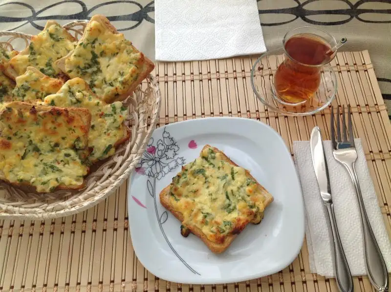 Ben bide içine mimik domates ve biber doğruyorum,kaşar rendeliyorum içine,varsa az bişeyde sucuk katıyorumsonra yemede yanında yat..
